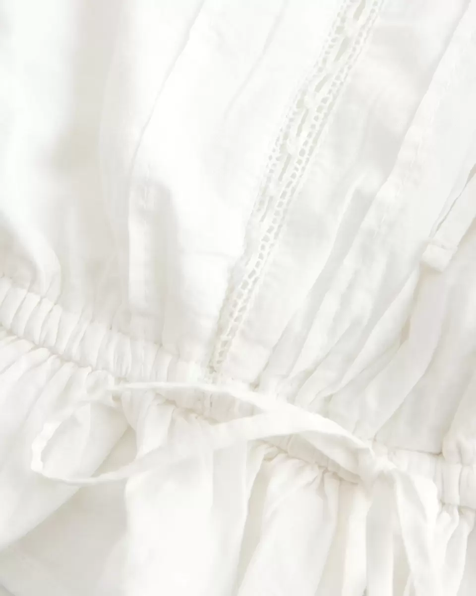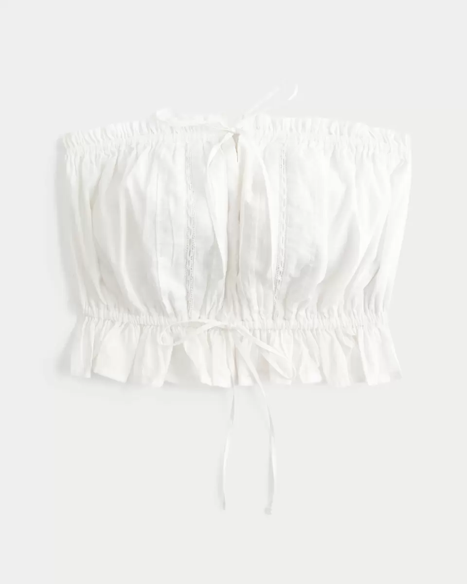 Denna supermjuka tubtopp är perfekt för varmt, soligt väder! Tillverkad av voiletyg, axelbandslös siluett med knytband vid halsringning och midja, vackra spetsinlägg, volangkanter. Easy Fit. Importerad.