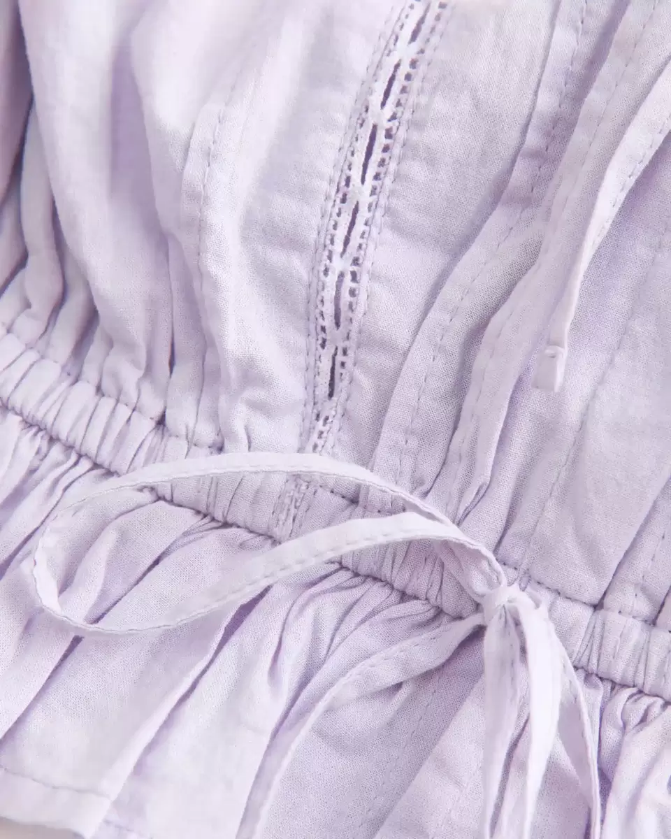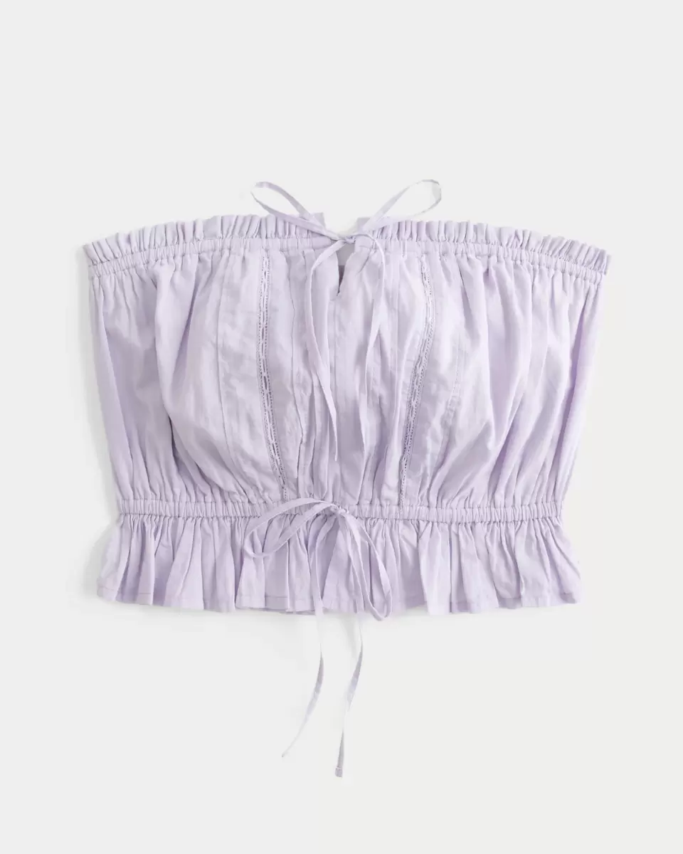 Denna supermjuka tubtopp är perfekt för varmt, soligt väder! Tillverkad av voiletyg, axelbandslös siluett med knytband vid halsringning och midja, vackra spetsinlägg, volangkanter. Easy Fit. Importerad.
