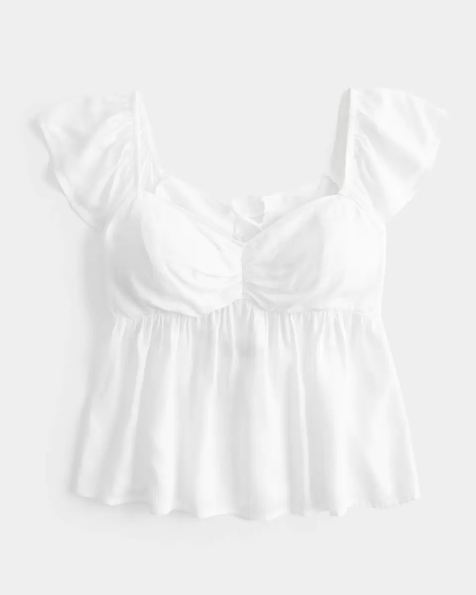 Din nya favorittopp är designad med en babydoll-siluett, fladdrande ärmar och en öppen rygg med snörning. Inbyggda bystdynadetaljer, flytande fåll. Easy Fit. Importerad.