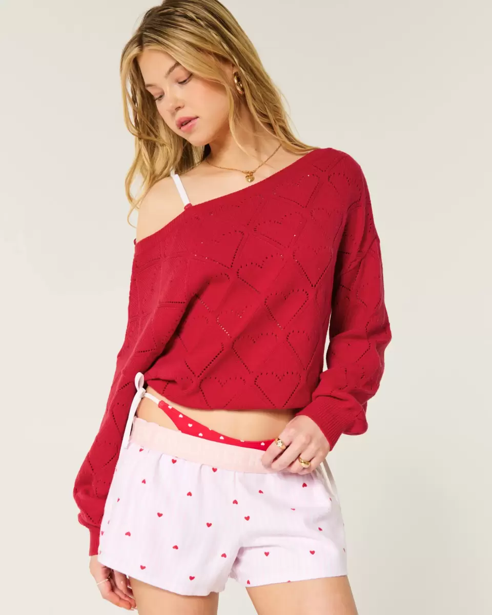 Mysig och supermjuk, den här tröjan har alla hjärtans dag-inspirerade stickade hjärtmönster. Avslappnad halsringning kan bäras från ena axeln, ribbad kant, långa ärmar. Easy Fit. Importerad.