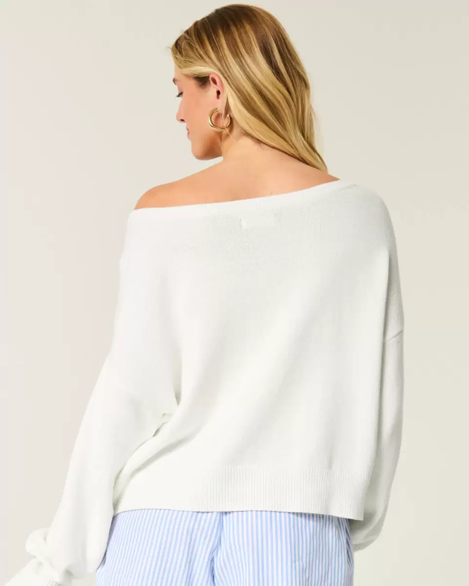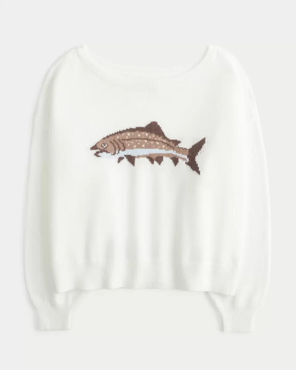 Mysig och supermjuk, den här tröjan har en fisk-intarsia-grafik och en off-the-shoulder-ringning. Ribbade kanter, långa ärmar. Easy Fit. Importerad.