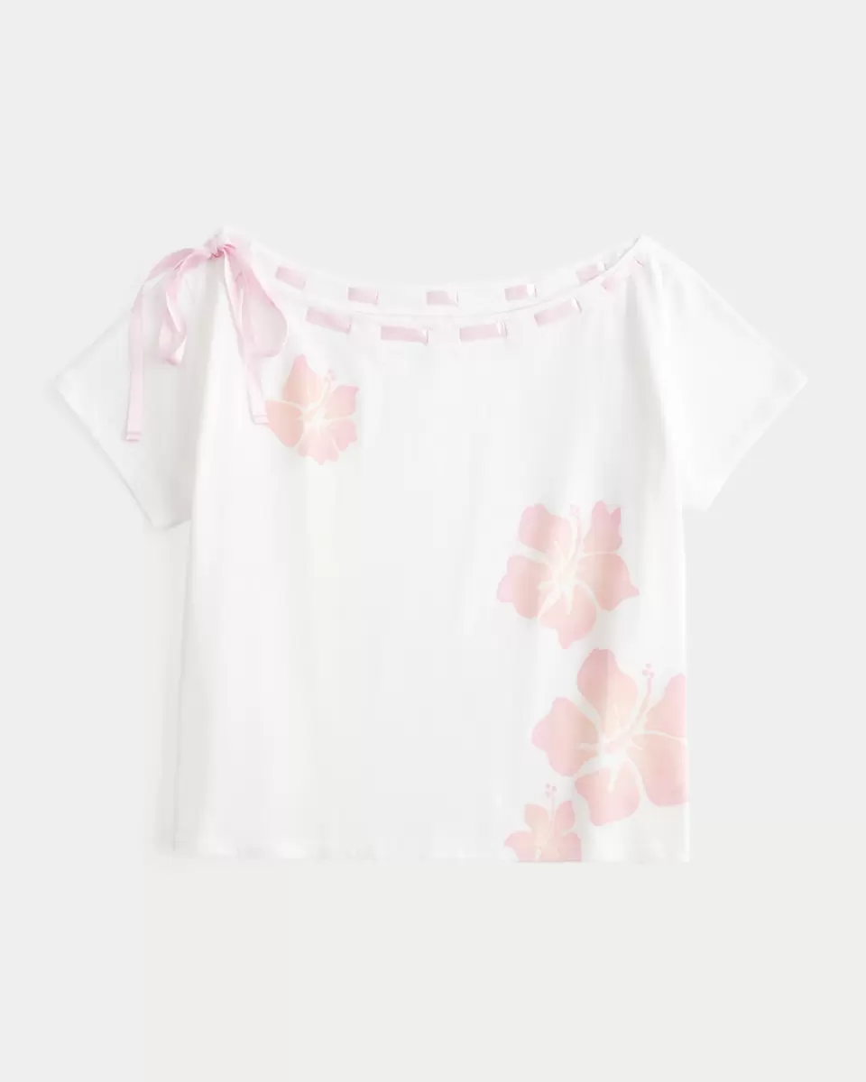 Gjord av supermjuk 100 % bomull, den här t-shirten har en off-the-shoulder halsringning med en vacker knytdetalj. Söt blommigt grafiskt mönster, korta ärmar. Easy Fit. Importerad.