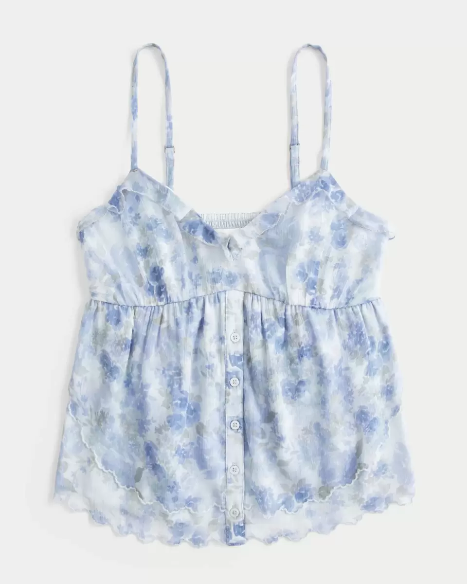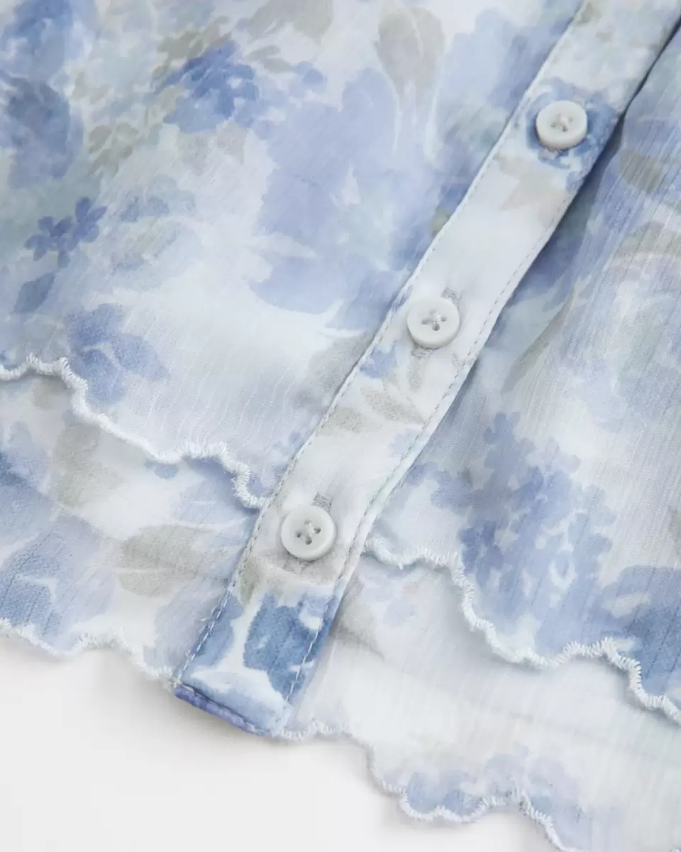 Tillverkad med supermjukt, flytande krinklet chiffongtyg, denna babydoll-topp har volanger och en skiktad fåll med broderi. Knappdetaljer, mjuk smock bak. Ser fantastiskt ut klädd upp eller ner! Importerad.