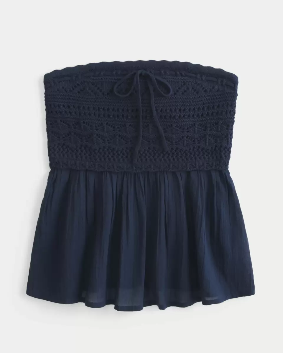 Denna axelbandslösa babydoll-topp har en byst i virkad stil, en skrynklig voile-kjol och en smockad rygg för komfort. Passementsdetalj längs med halsringningen ger en touch av elegans. Easy Fit. Importerad.