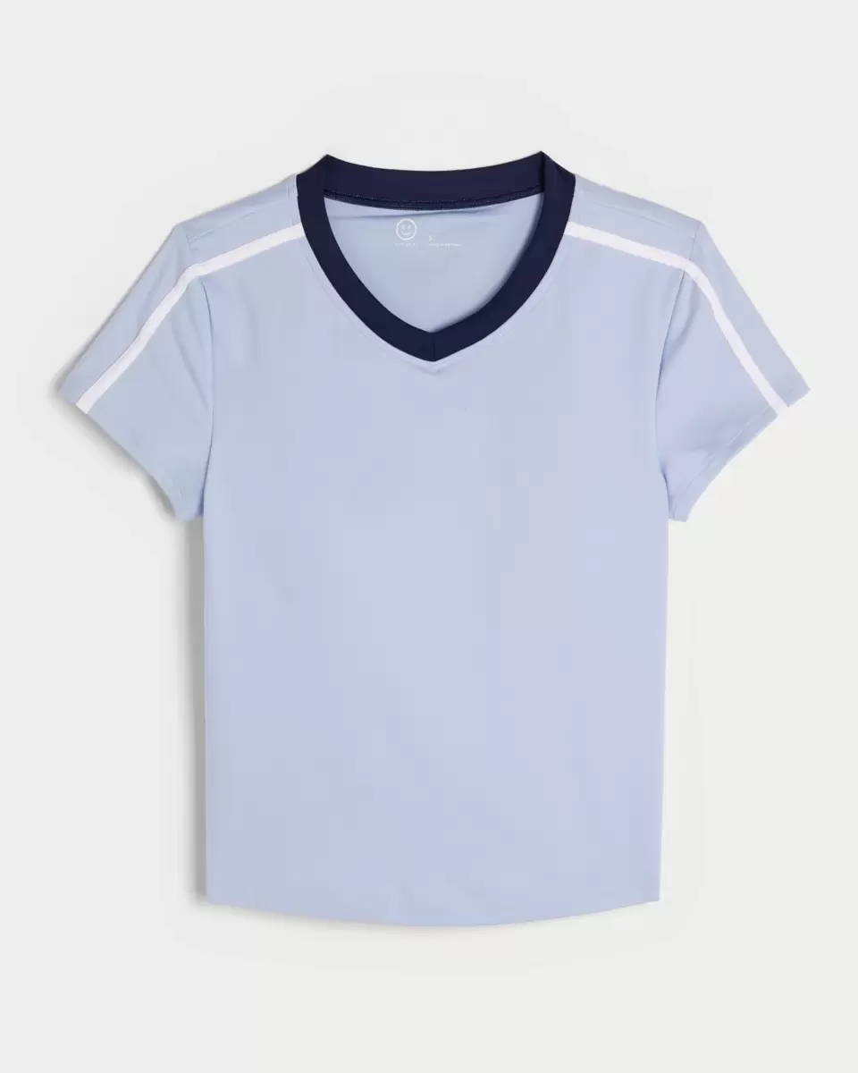 Denna supermjuka och sköna baby-t-shirt har en v-ringning och sportig rand längs ärmarna. Kort ärm, inbyggd hyllbh med avtagbara kuddar. Importerad.