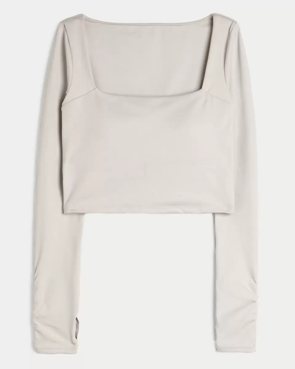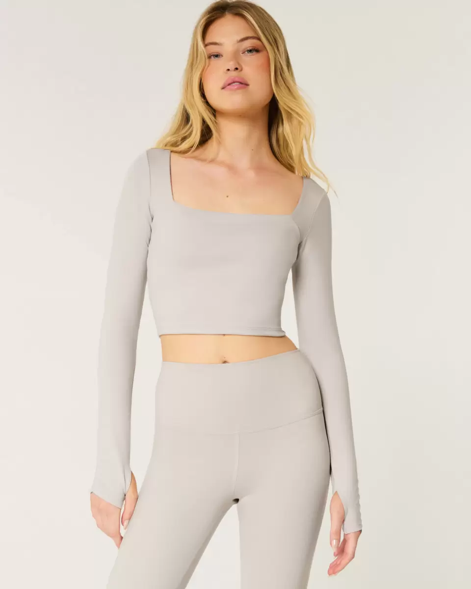Designat i vårt andningsbara, 4-vägs stretch, fukttransporterande Recharge-tyg med en supermjuk, borstad känsla. Denna topp har en fyrkantig halsringning och långa ärmar med tumöppningar. Importerad.