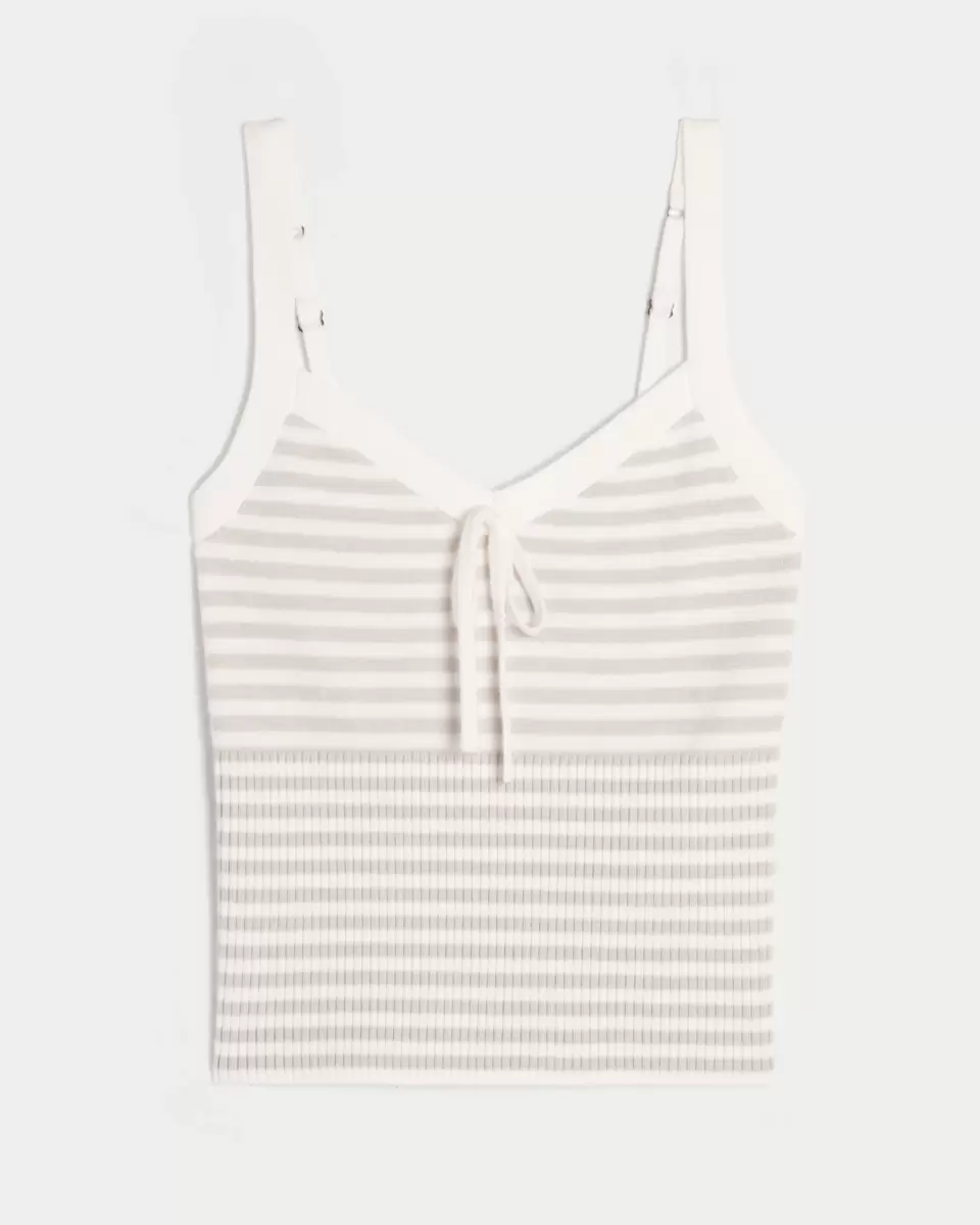 En supermjuk tröjastickad tank med en vacker knytdetalj i mitten av halsen. Ribbstickad fåll, justerbara remmar. Importerad.