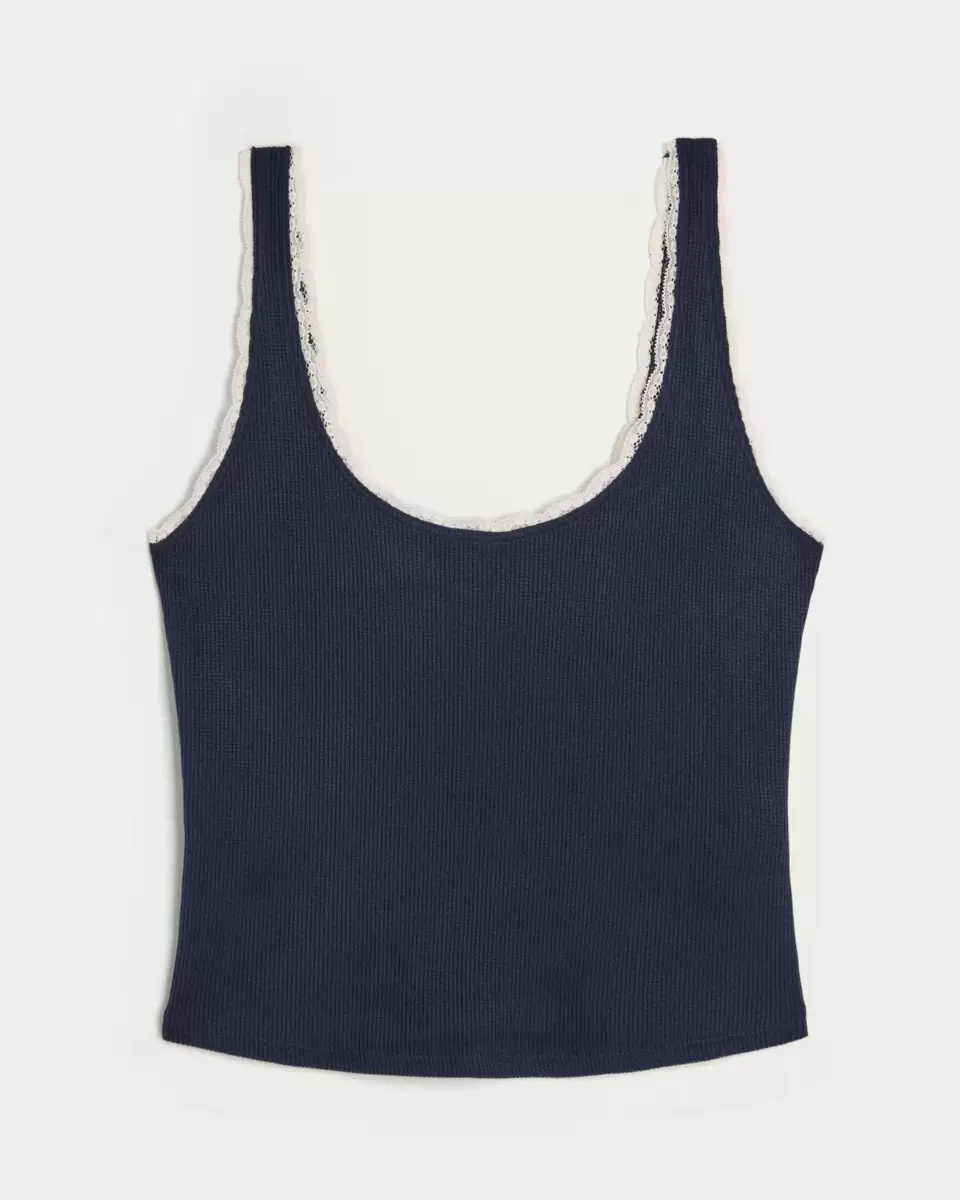 En söt och mysig tank i supermjukt våffeltyg, med snygg spetskant. Importerad.