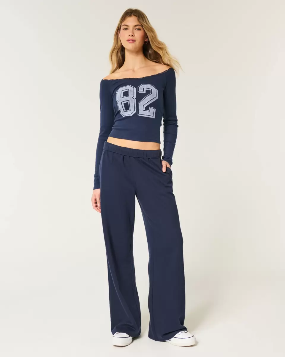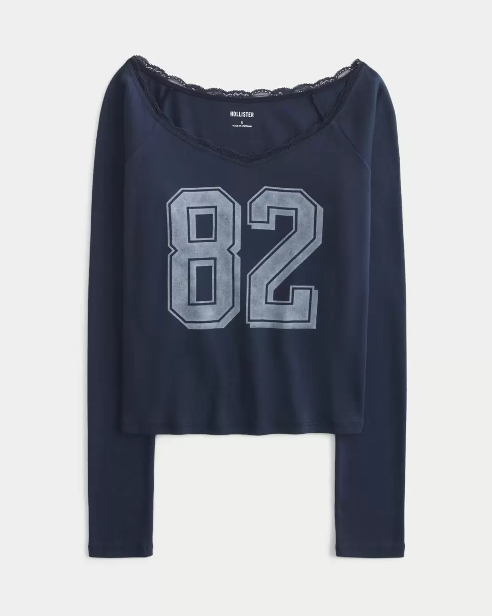 En supermjuk t-shirt i 100 % bomull med en off-the-shoulder-ringning med vackra spetskanter och grafik med nummertryck. Långa ärmar. Slim Fit. Importerad.