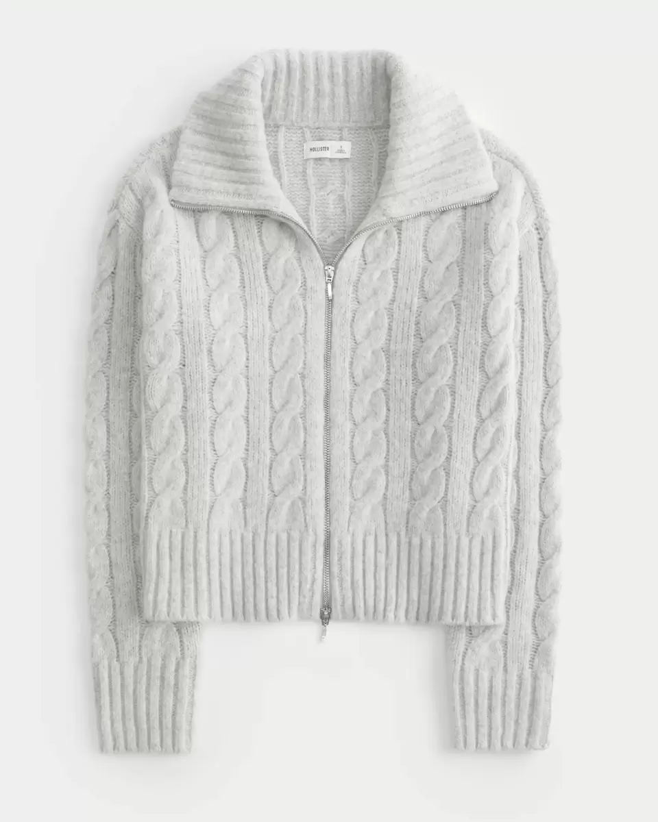 En söt och bekväm tröja gjord med vårt ultramysiga Comfy Cloud-stickade tyg. Uppvikbar mock-neck-krage, full dragkedja, kabelstickat mönster, ribbade kant. Easy Fit. Importerad.