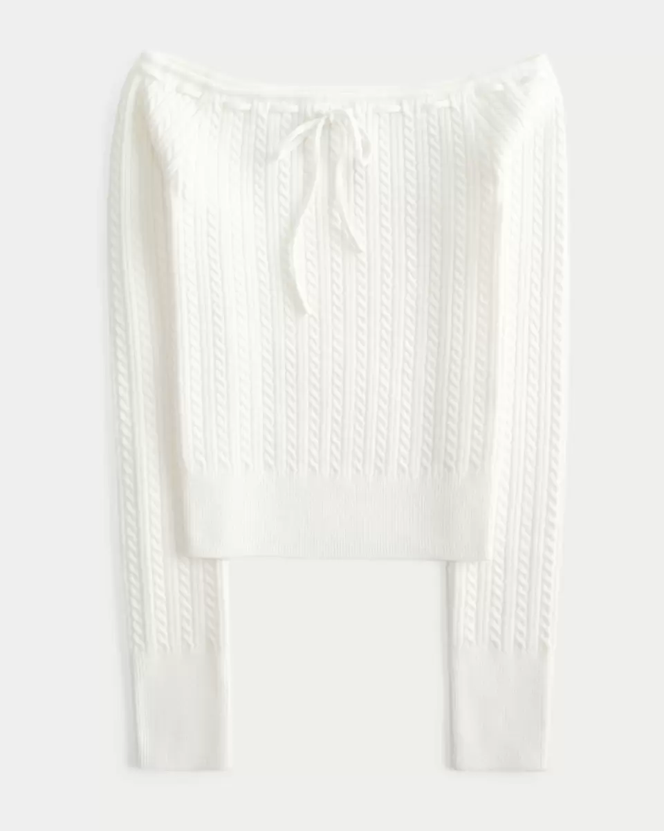 Söt och mysig, den här supermjuka tröjan har kabelstickade mönster och en off-the-shoulder urringning med passande detaljer. Långa ärmar, ribbad kant. Slim Fit. Importerad.