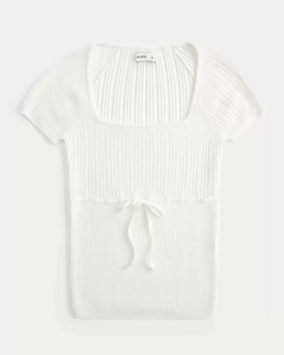 Söt och supermjuk, den här kortärmade tröjan har ribbad struktur och en knytdetalj genom midjan. Fyrkantig halsringning. Importerad.