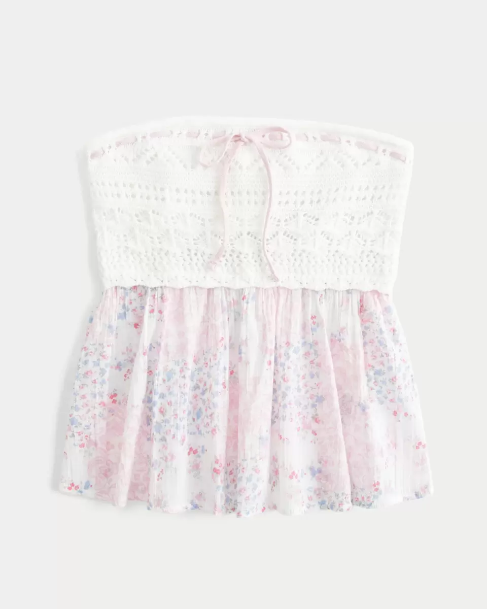 Nätt och supermjuk, denna axelbandslösa babydoll-topp har en byst i virkat tyg med knytdetaljer genom halsen och en flytande fåll. Easy Fit. Importerad.
