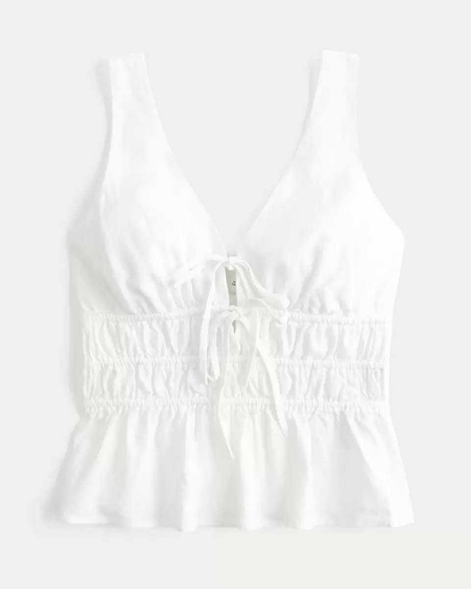 En söt peplum-topp i en mjuk linneblandning, med en knytdetalj fram och kanaliseras genom midjan. V-ringning. Slim Fit. Importerad.