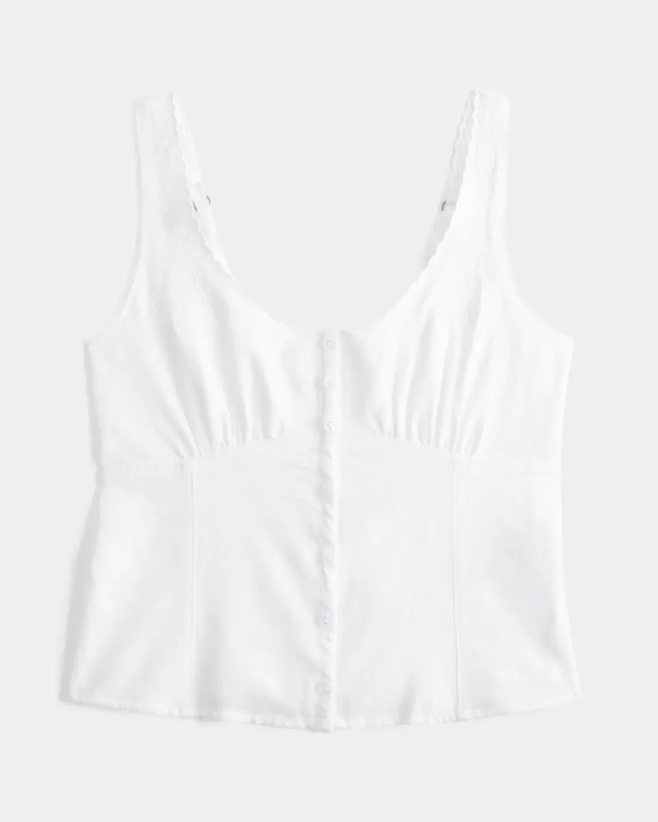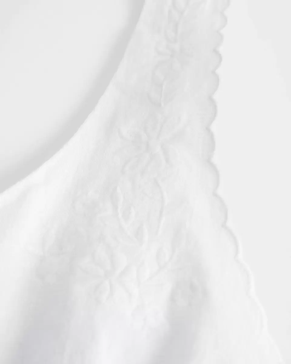 Den här vackra blusen har vackra broderade detaljer och bågad kant längs remmarna, en urringning och stängning med knappar. Mjuk smockad rygg. Slim Fit. Importerad.