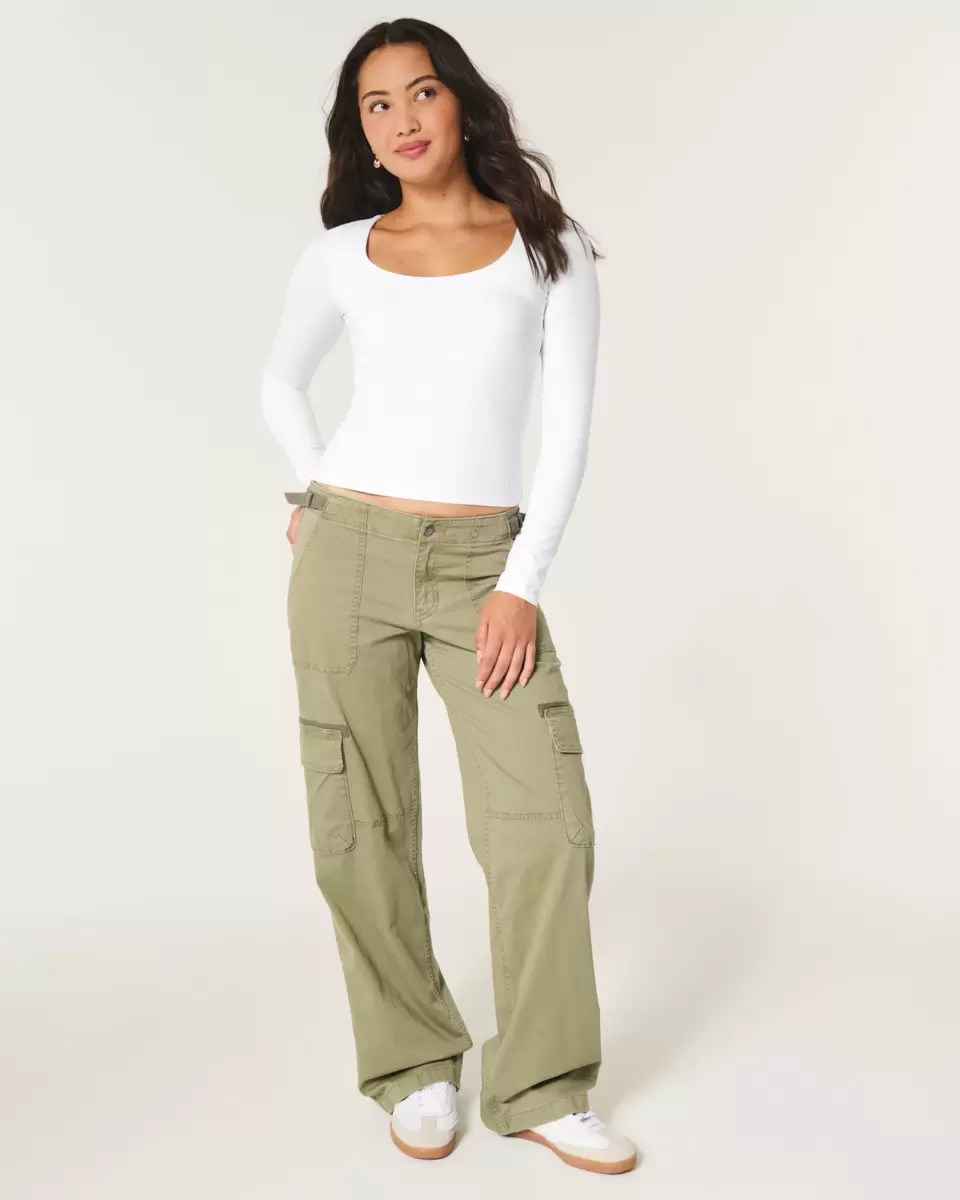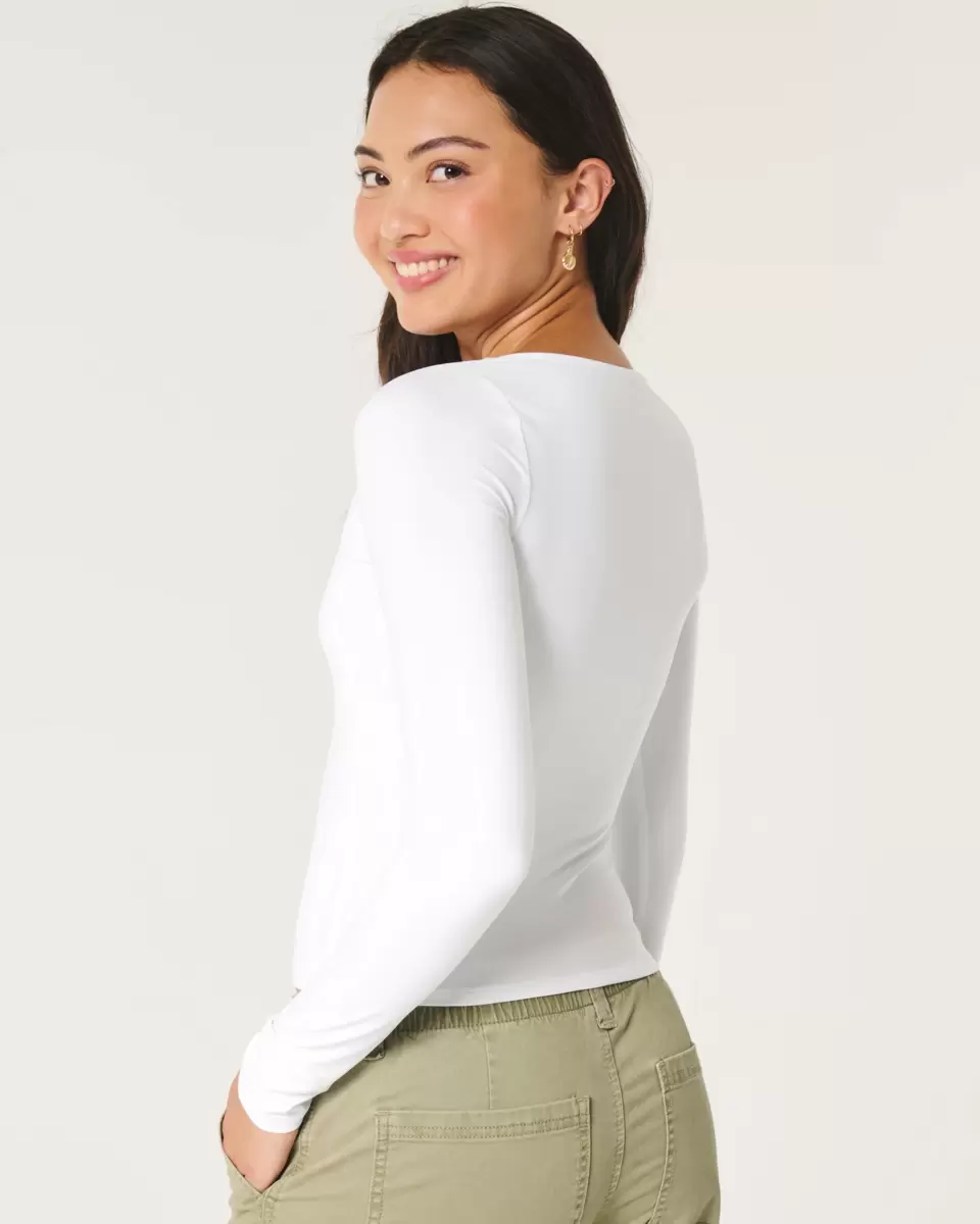 Söt och bekväm, denna långärmade topp är gjord av mjukt stretchtyg med en sömlös look och känsla. Scoop urringning, inbyggd hyllbh. Slim Fit.