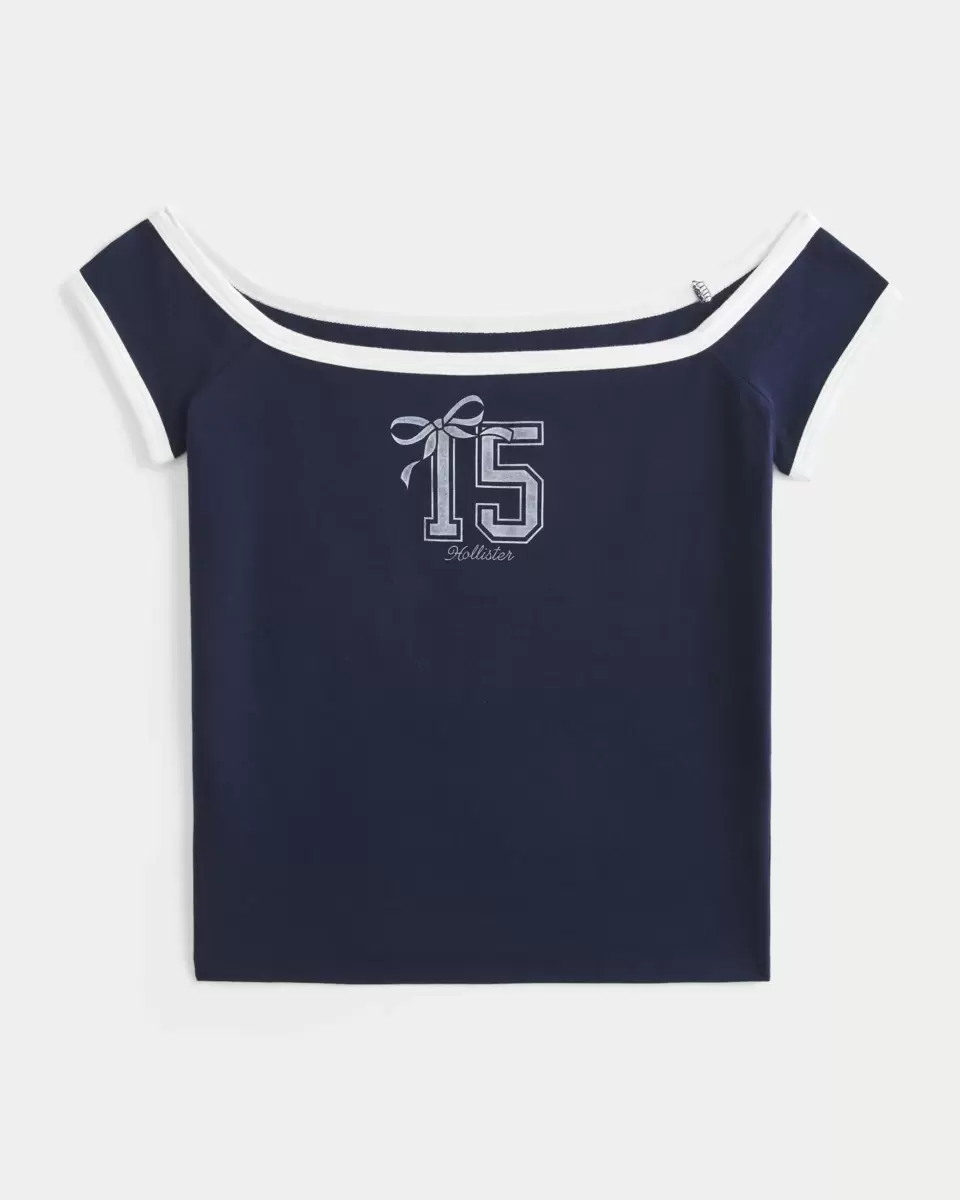 Supermjuk och söt, den här t-shirten har en grafisk logotyp och sportig nummerdetaljer. Off-shoulder halsringning, korta ärmar. Slim Fit. Importerad.