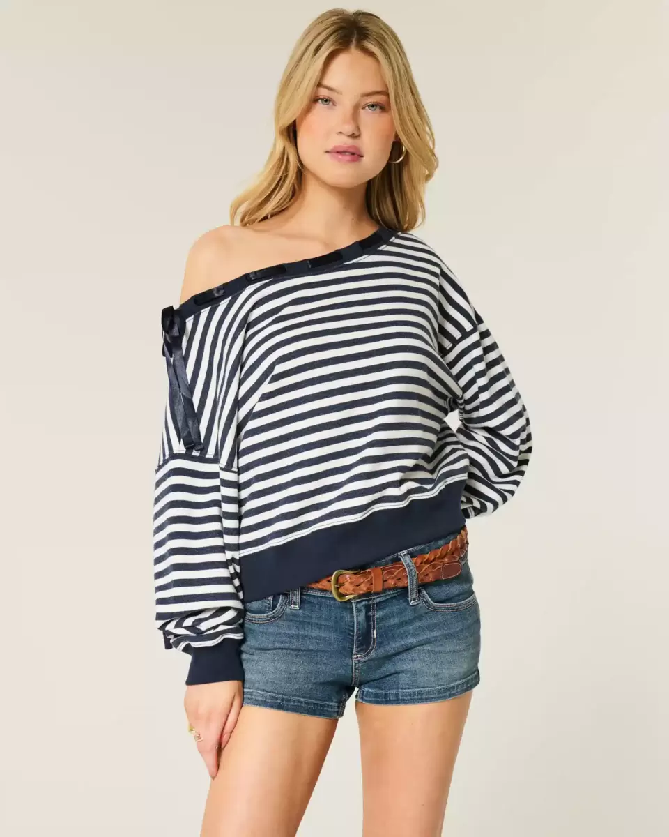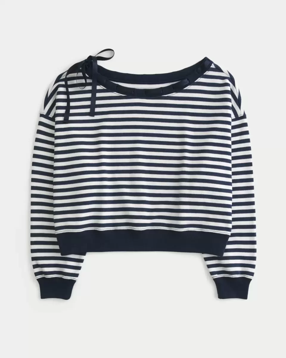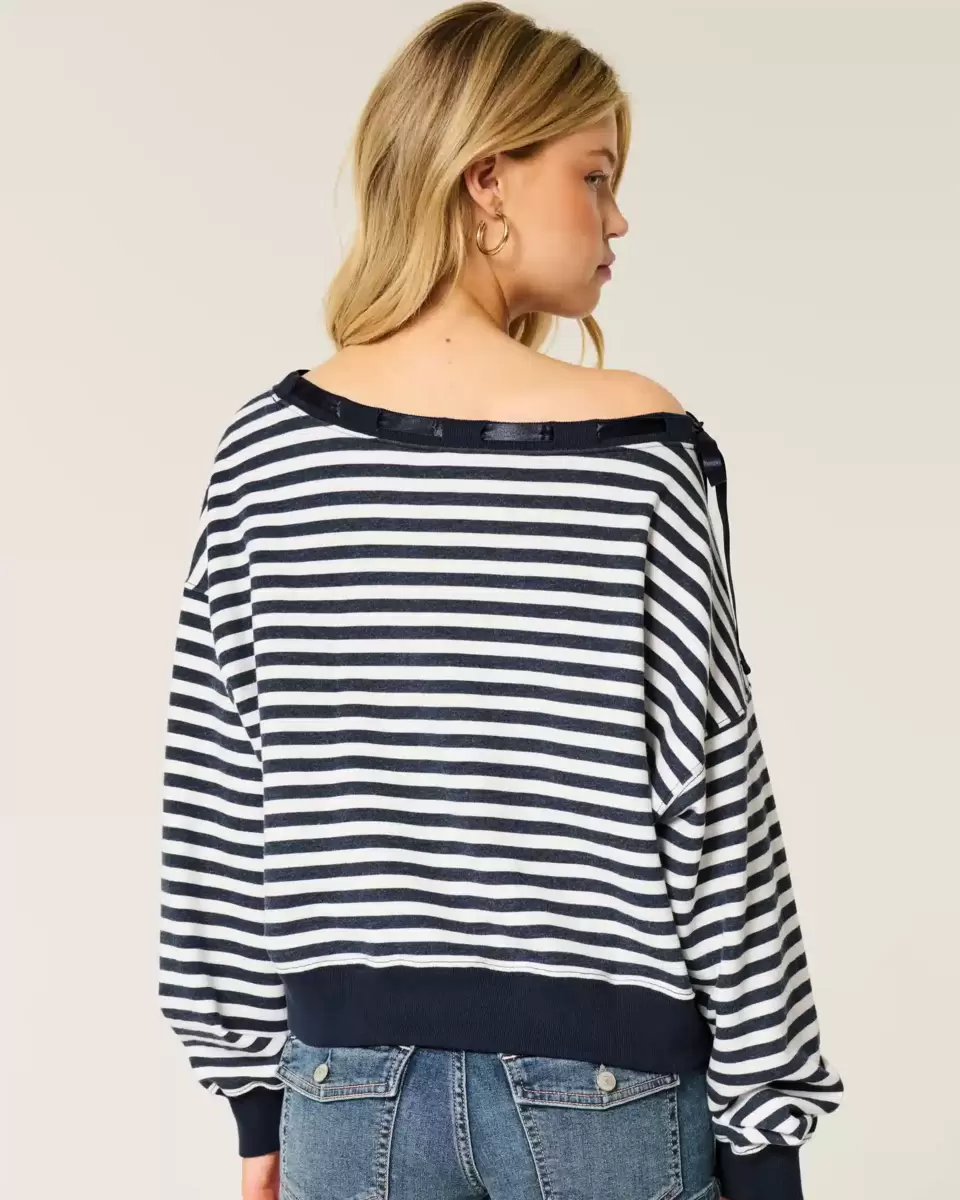 Denna supermjuka tröjan har en off-the-shoulder-ringning med en vacker knytdetalj. Långa ärmar. Importerad.