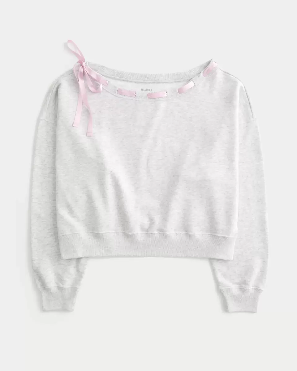 Denna supermjuka tröjan har en off-the-shoulder-ringning med en vacker knytdetalj. Långa ärmar. Importerad.