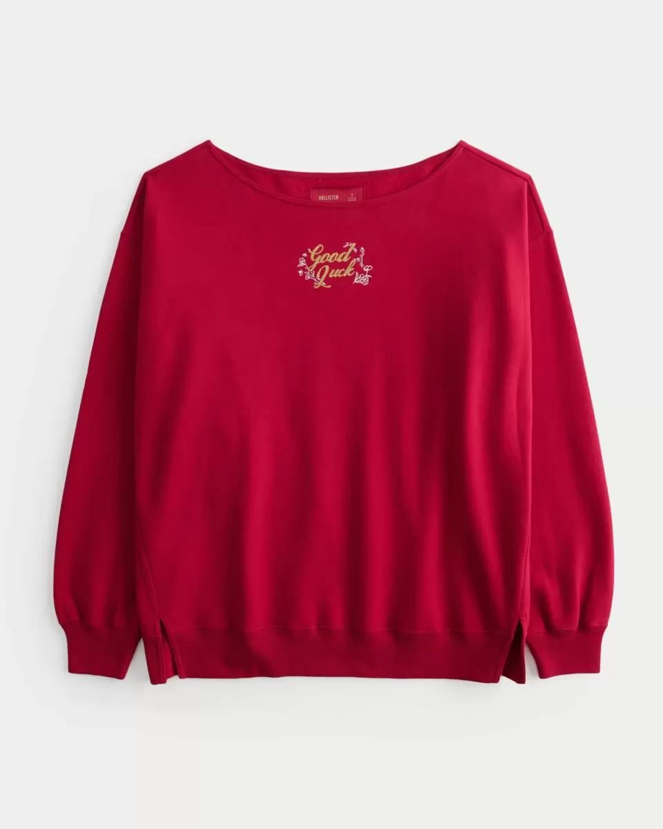Denna supermjuka och mysiga fleecetröja har en broderad Lunar New Year-inspirerad Good Luck-detalj. Off-shoulder halsringning, långa ärmar. Överdimensionerad passform. Importerad.