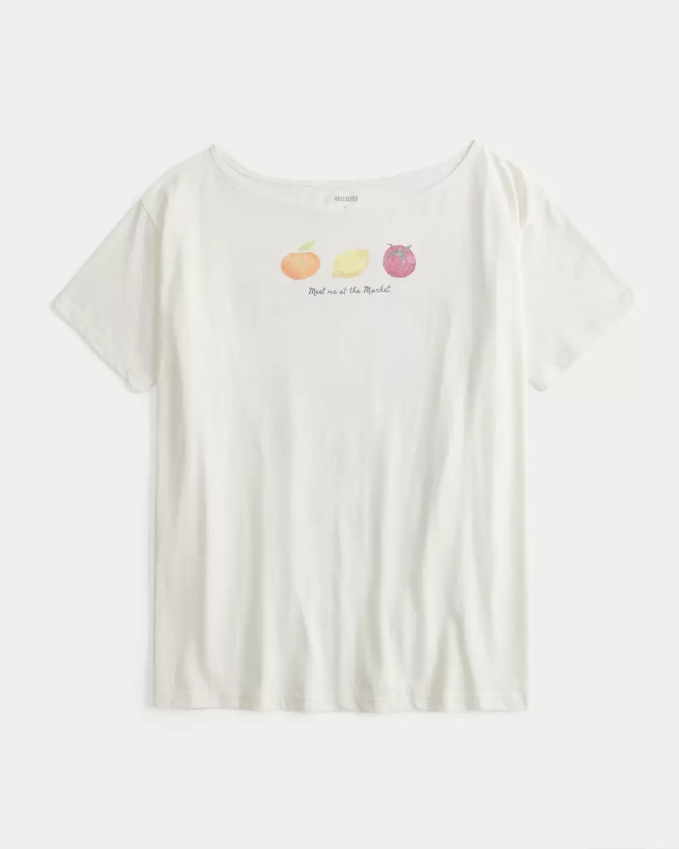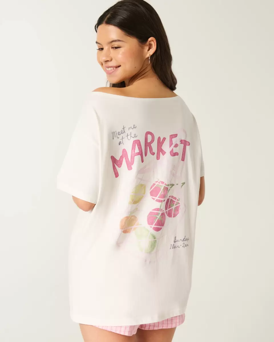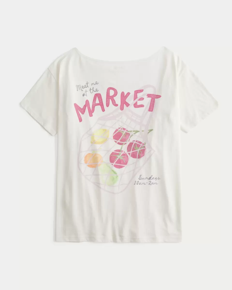 En supermjuk t-shirt i 100 % bomull med en avslappnad halsringning utanför axeln, med grafik från farmers market med en handmålad look fram och bak. Korta ärmar. Överdimensionerad passform. Importerad.