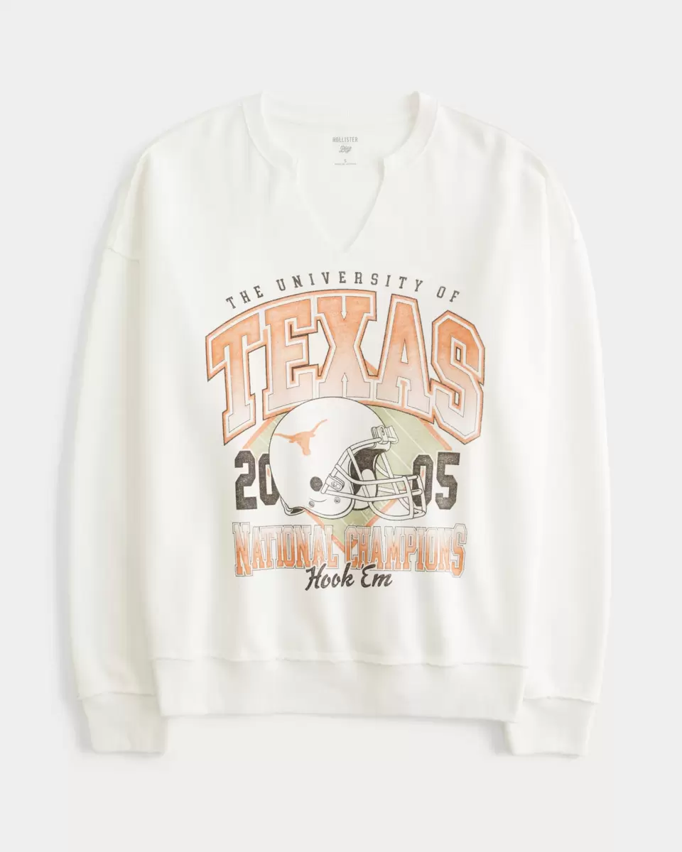 En supermjuk fleecetröja med officiellt licensierad University of Texas UT Austin fotbollsgrafik, en naggad halsringning och långa ärmar. Överdimensionerad passform. Importerad.