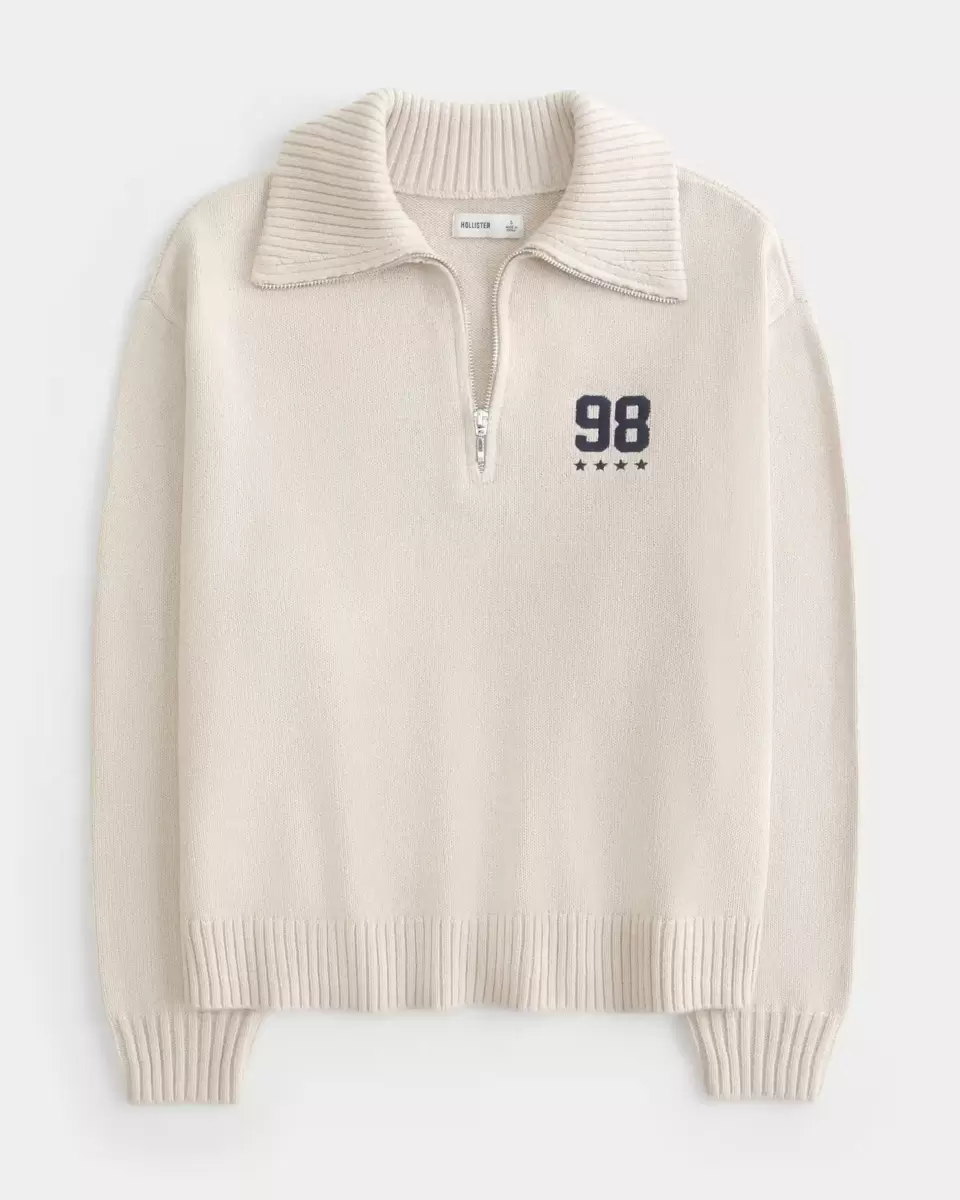 En mysig och supermjuk tröja med vikkrage och halvdragkedja. Ribbade kanter, långa ärmar, sportigt broderat nummergrafiskt broderi på vänster bröst. Oversized Fit.