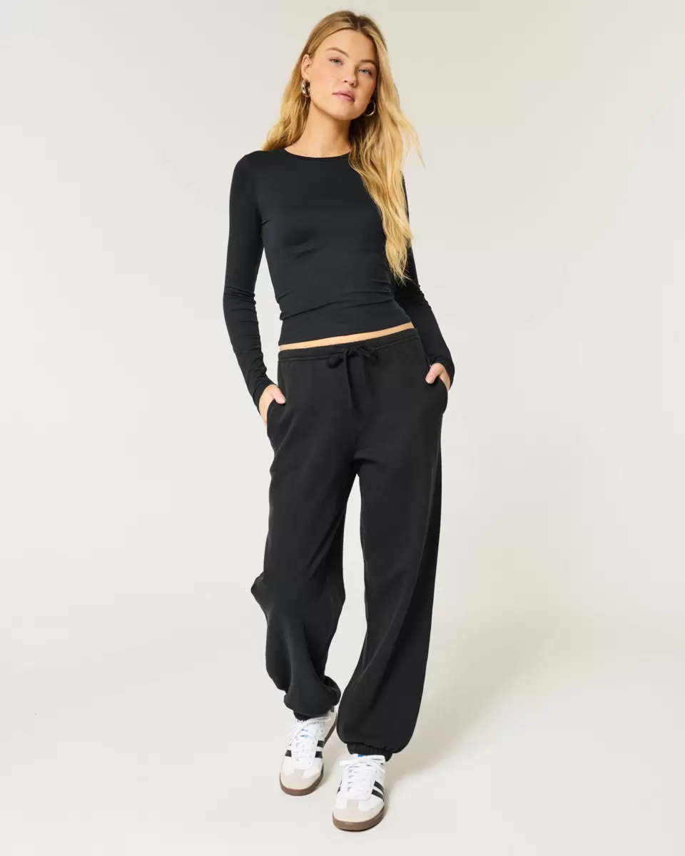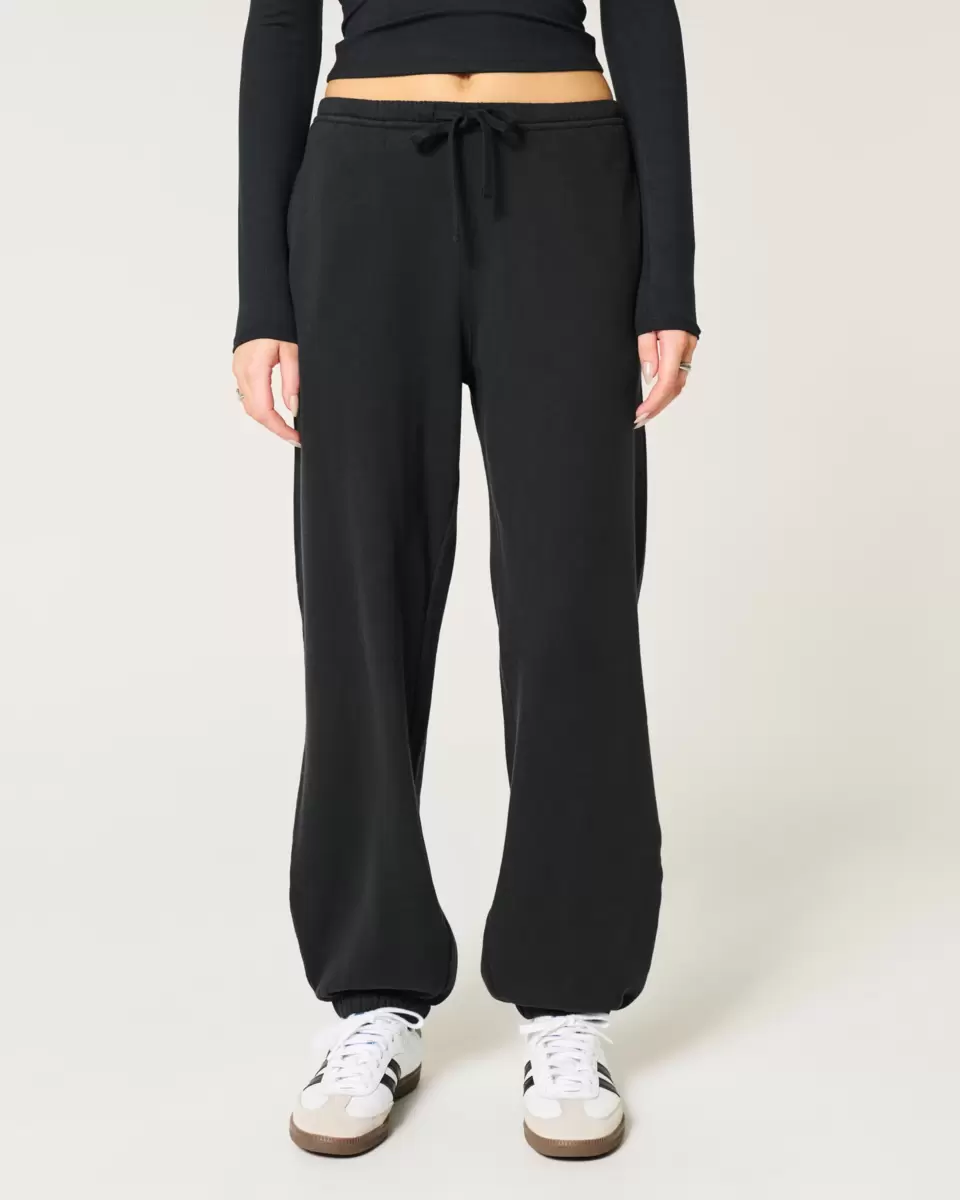 Supermjuka joggingbyxor i fleecetyg, designade med dragsko i midjan och bandfållar. Fickor, baggy ben. Importerad.