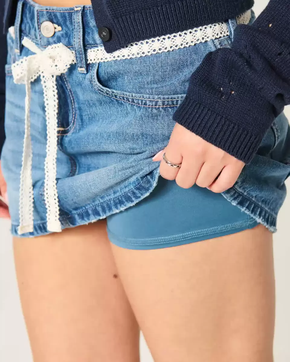 Ett sött minikort i denim designat med en låg midja och dolda stickade shorts. Avtagbar och justerbar spetsdetalj i midjan. Importerad.