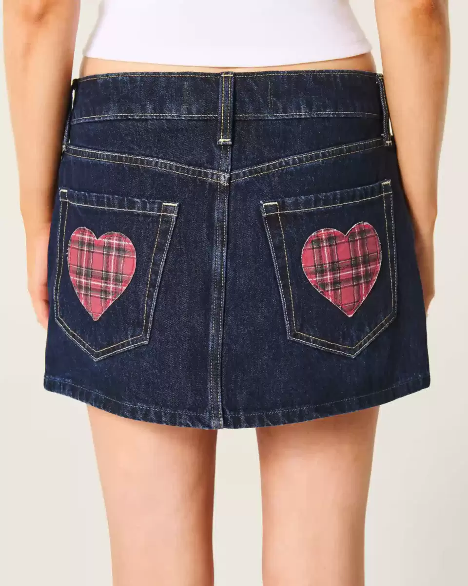 Ett sött, bekvämt minikort i denim med en rutig hjärtapplikation på bakfickan. Inbyggda shorts, mörk sköljtvätt, låg midja.