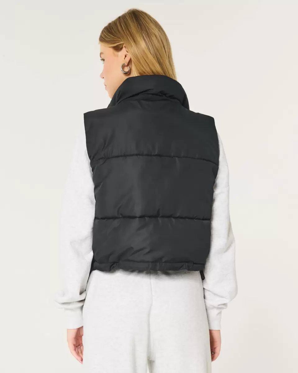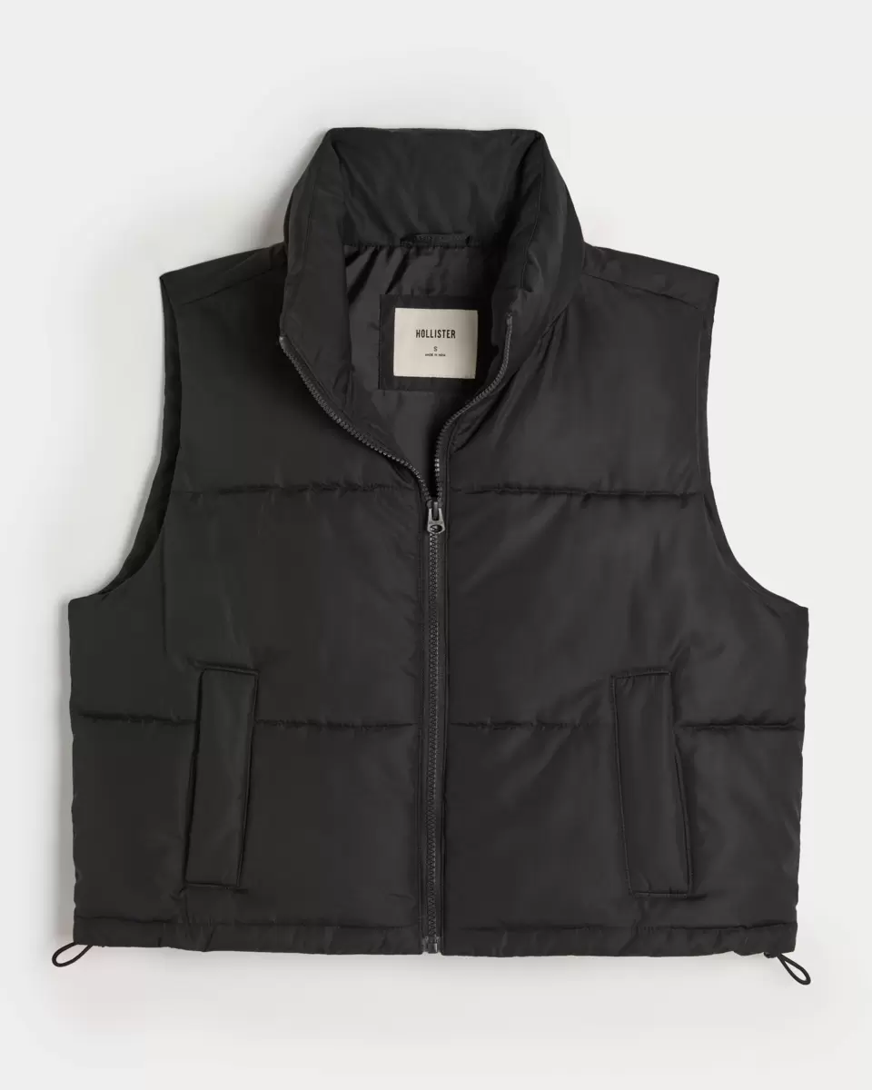 En söt och bekväm liten pufferväst med dragkedja och mock-neck-krage. Fickor, dragsko i fåll. Importerad.