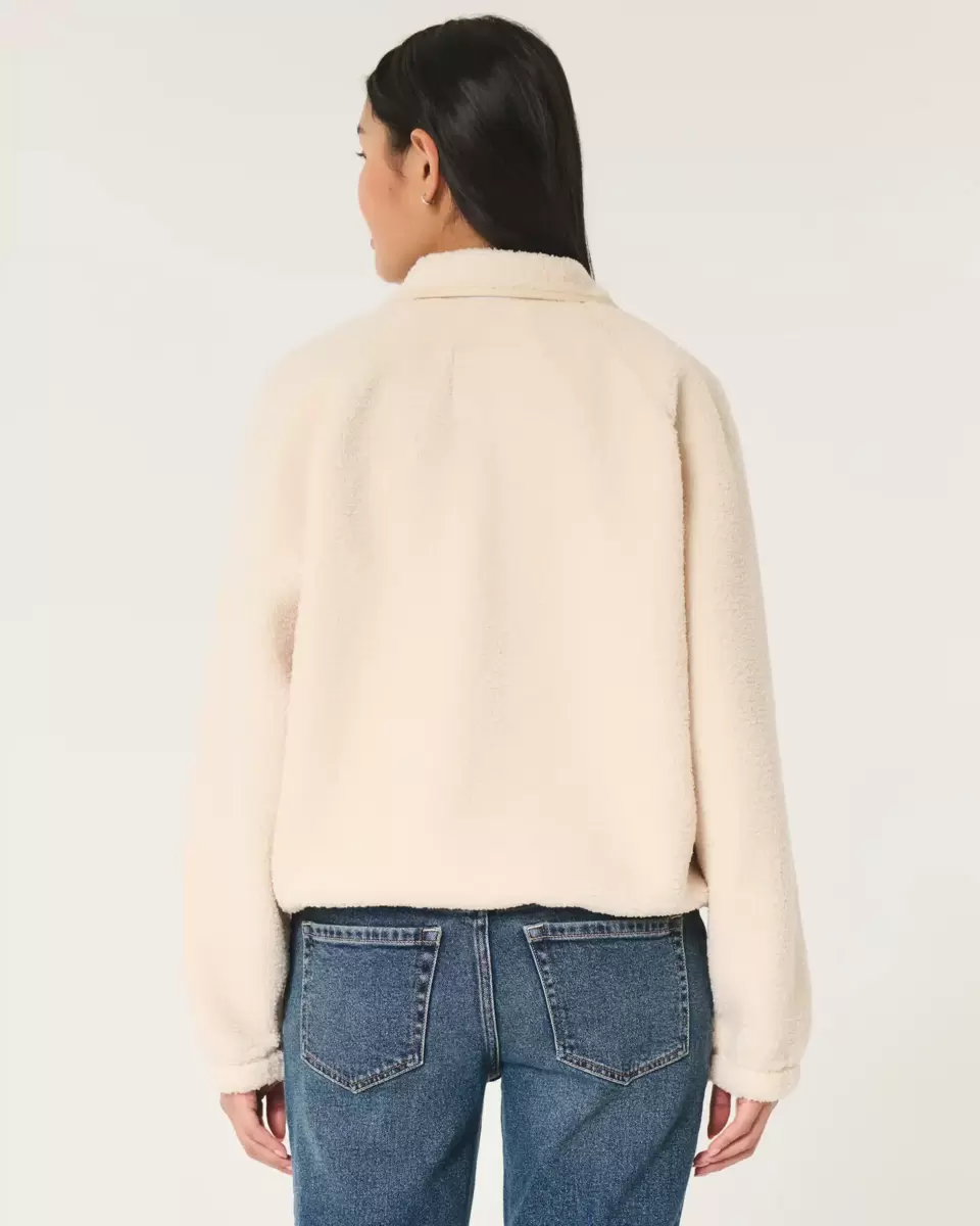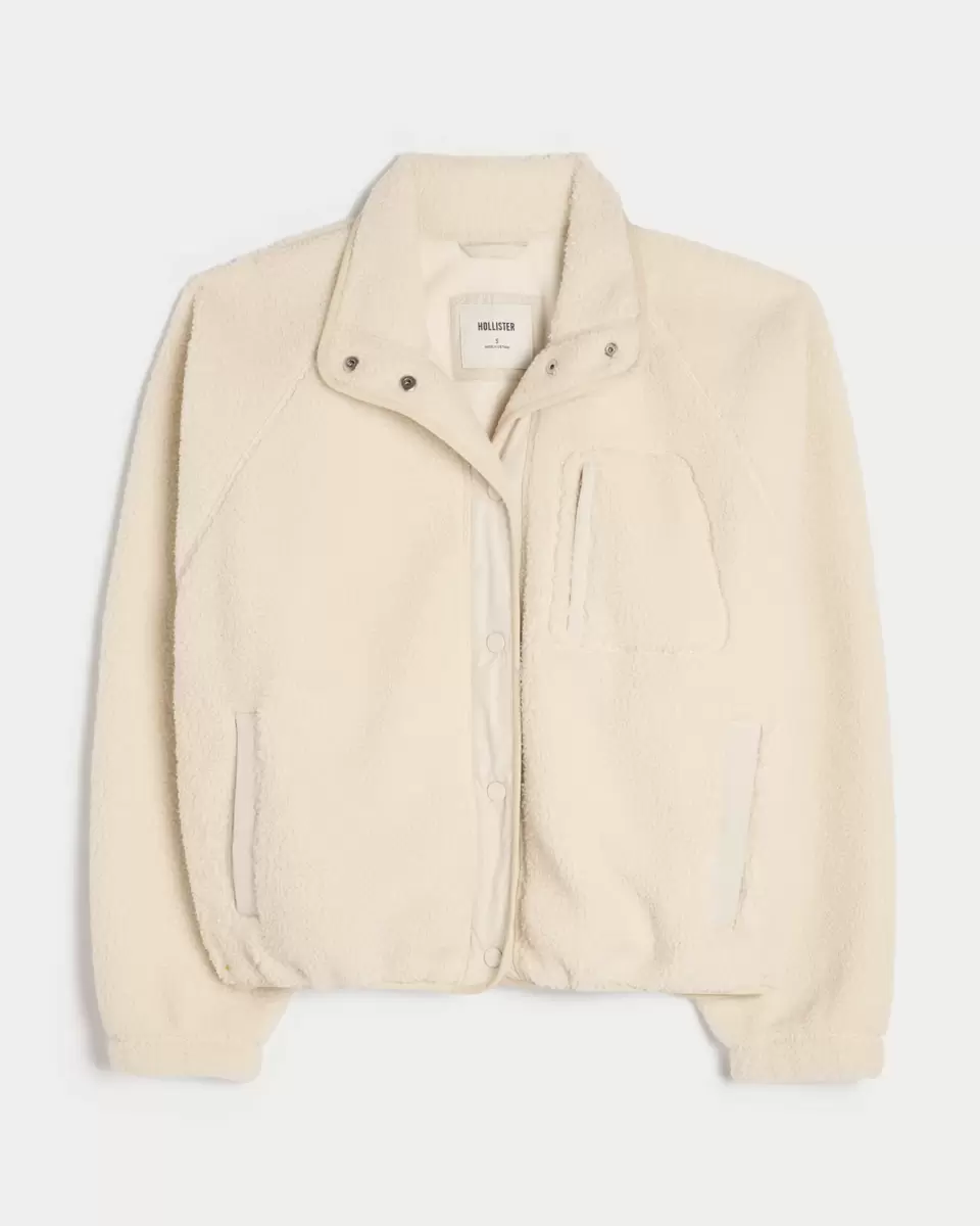 En supermjuk jacka i mysigt sherpatyg, designad med heltäckande snäppstängning, utvändig dragkedja på bröstficka och framfickor.
