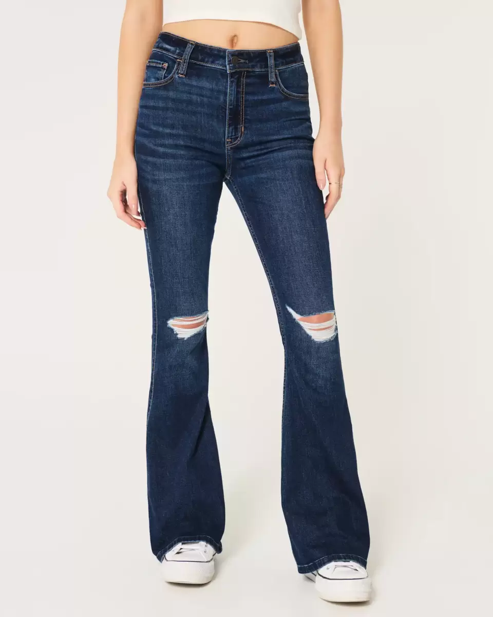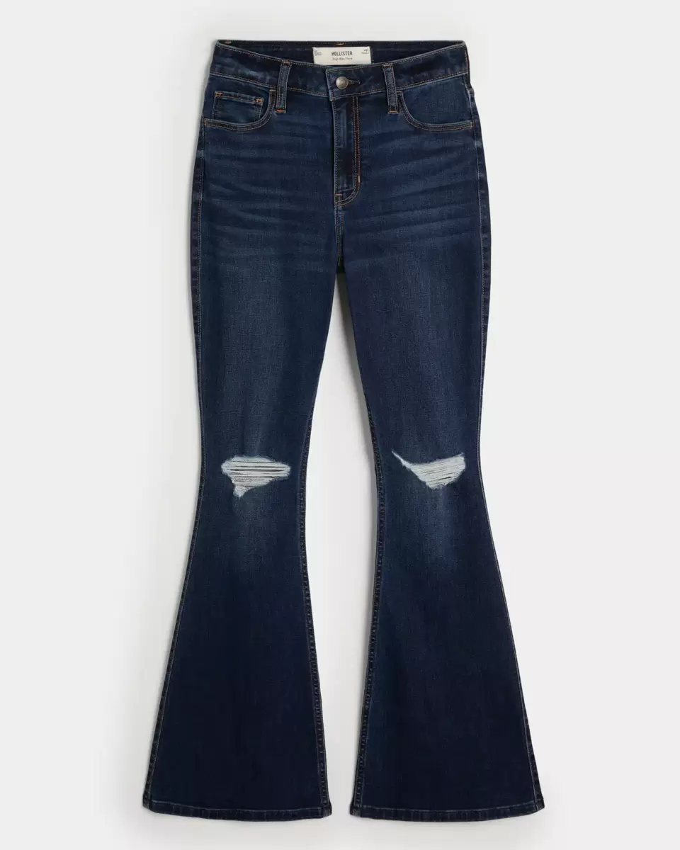 Klassiska jeans designade med hög midja, smala ben och utsvängd fåll. Mörk tvättad denim med stretch, blekning, morrhår och slitna detaljer. Importerad.