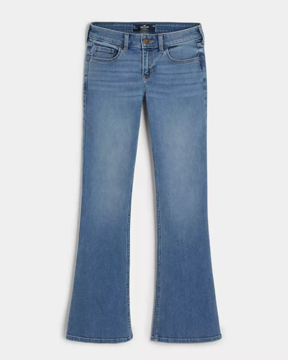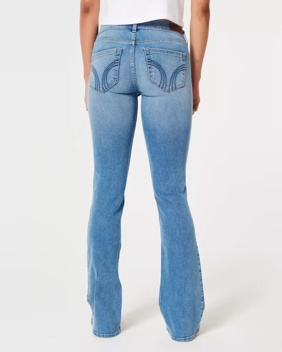 Smal genom låret med en bredare fåll under vristen, dessa medeltvättade bootjeans har en trendig låg midja. Blekning och morrhår. Importerad.