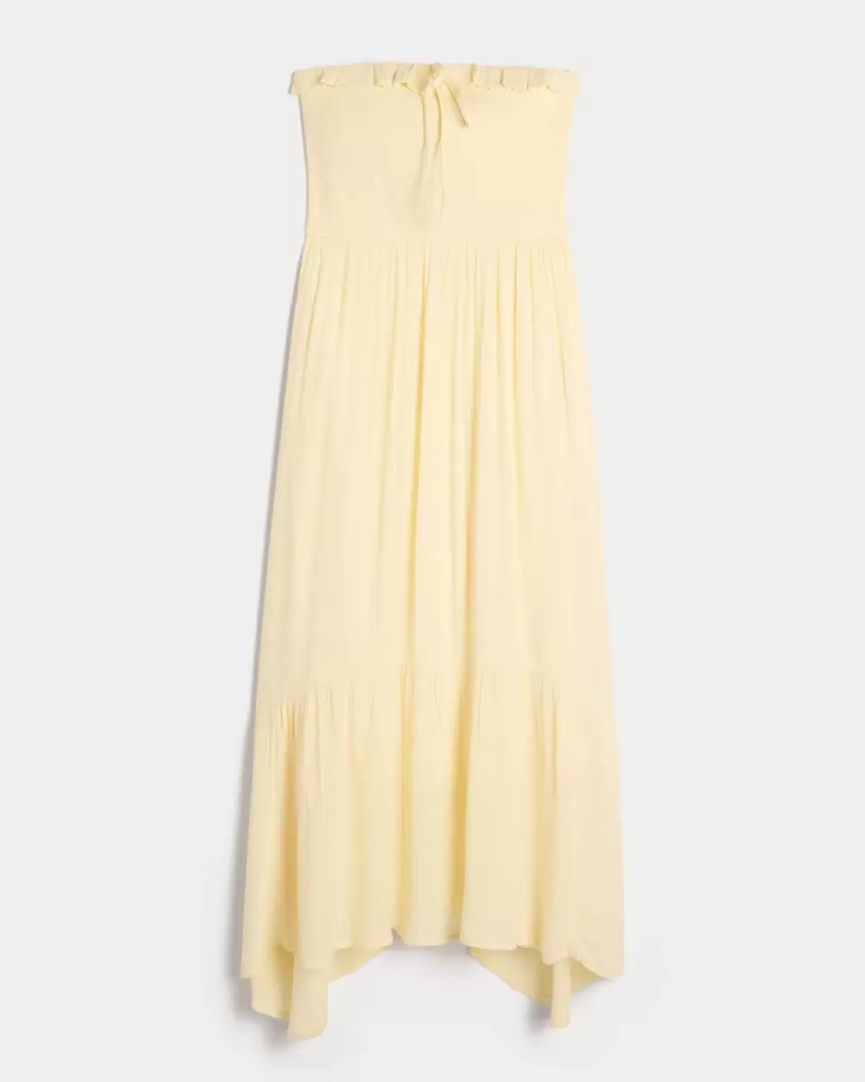 Flytig och supermjuk, den här maxilånga klänningen har en asymmetrisk fåll och en mjuk smockad överdel. Nätt volangringning med knytdetalj i mitten. Importerad.