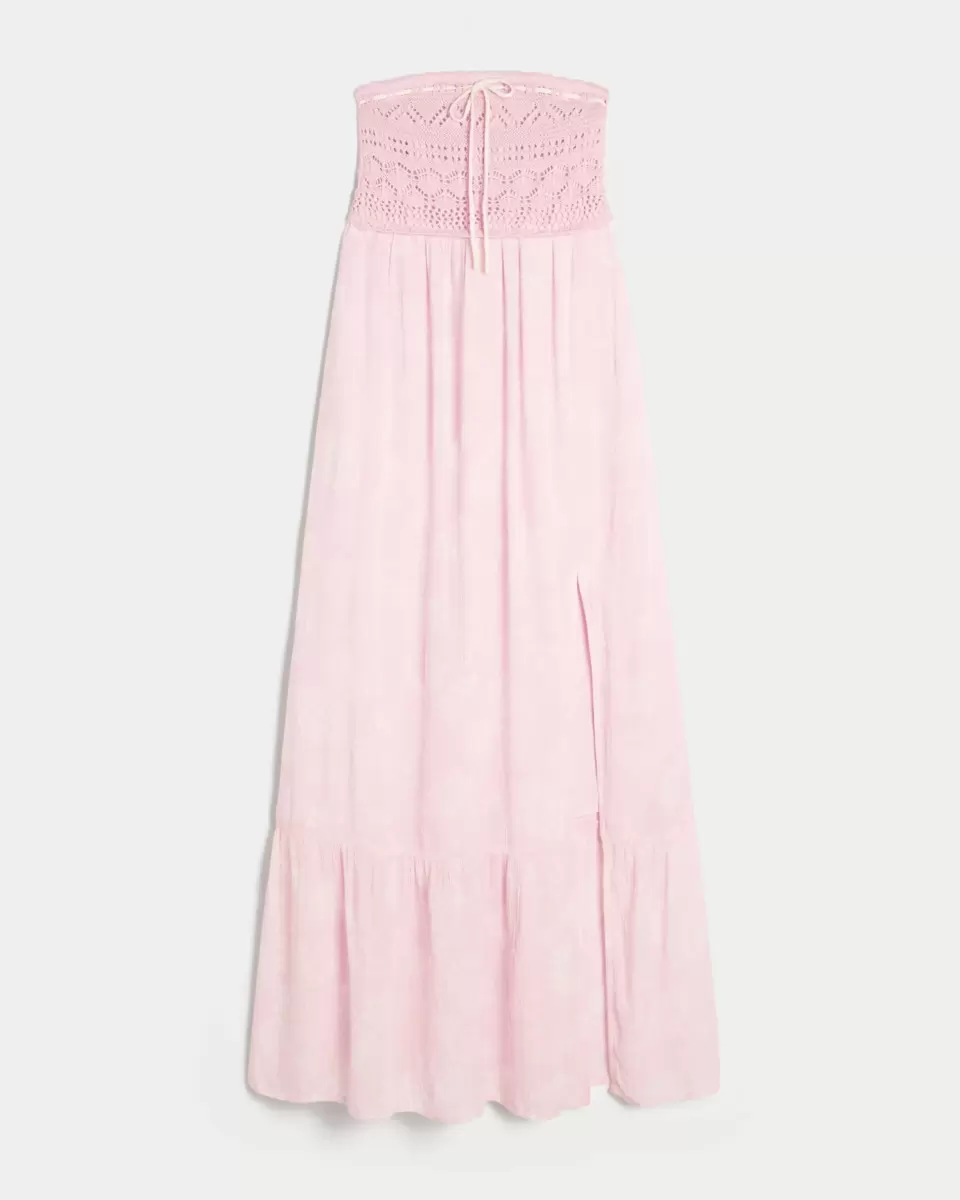 Flytig och supermjuk, den här klänningen har en virkad byst med knytband längs halsen. Draperad maxilång kjol med delad fålldetalj, avtagbara axelband. Importerad.
