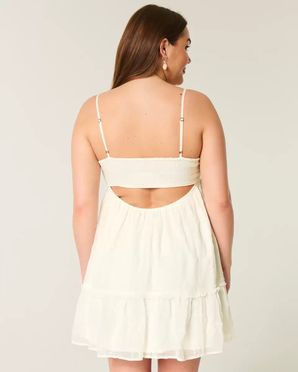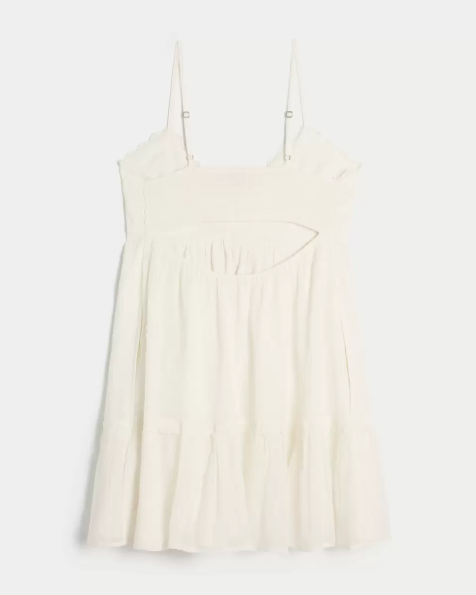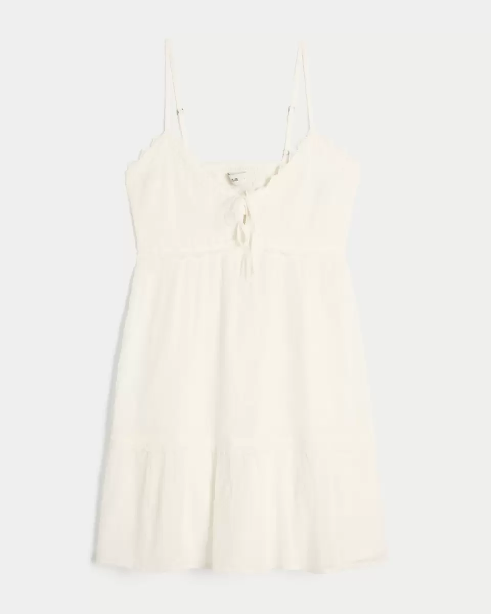 Denna flytande, festivalinspirerade miniklänning har en volangfåll och knytdetaljer i mitten vid halsen. Mjuk smockad rygg, justerbara remmar. Importerad.