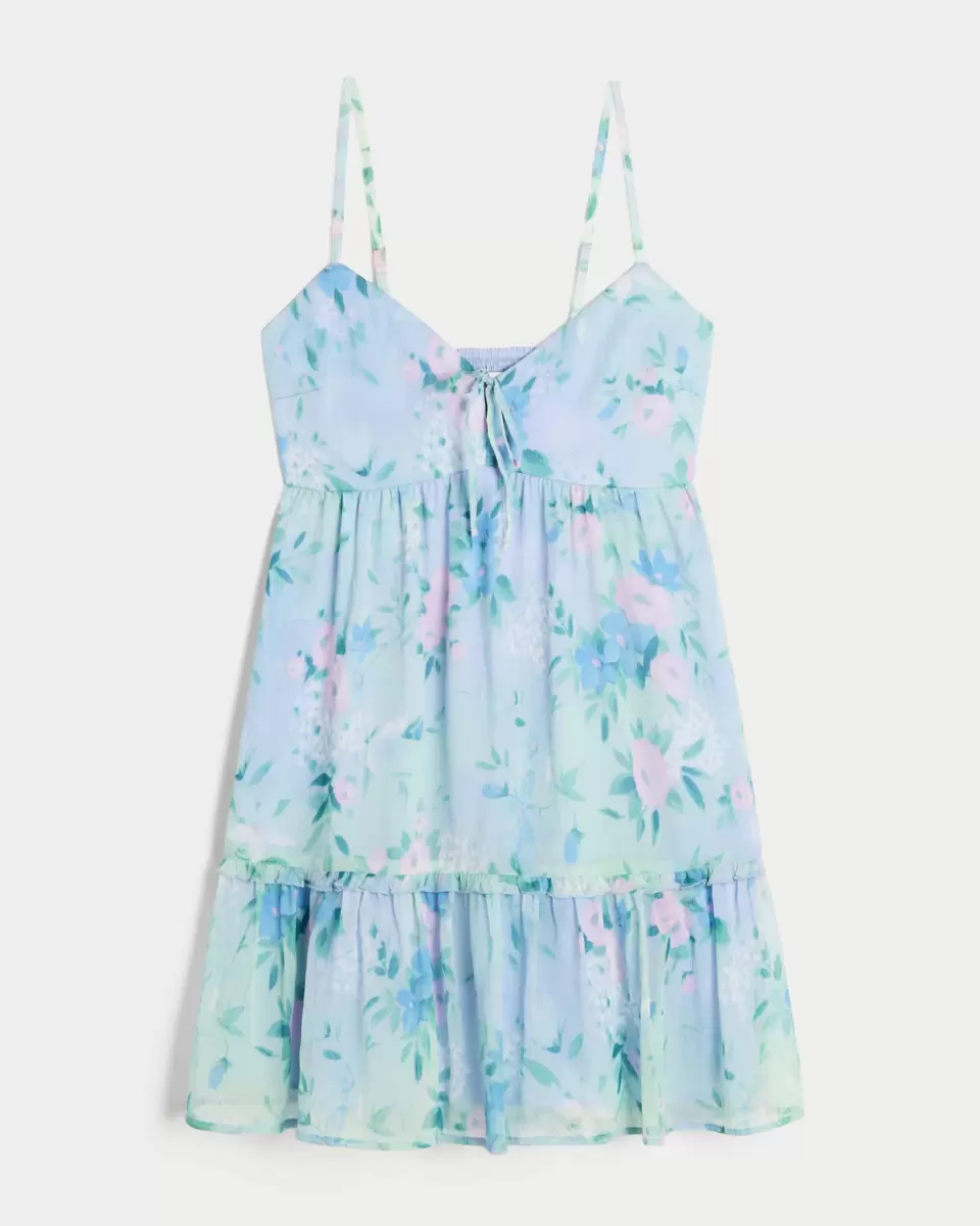 Denna flytande, festivalinspirerade miniklänning har en volangfåll och knytdetaljer i mitten vid halsen. Mjuk smockad rygg, justerbara remmar. Importerad.