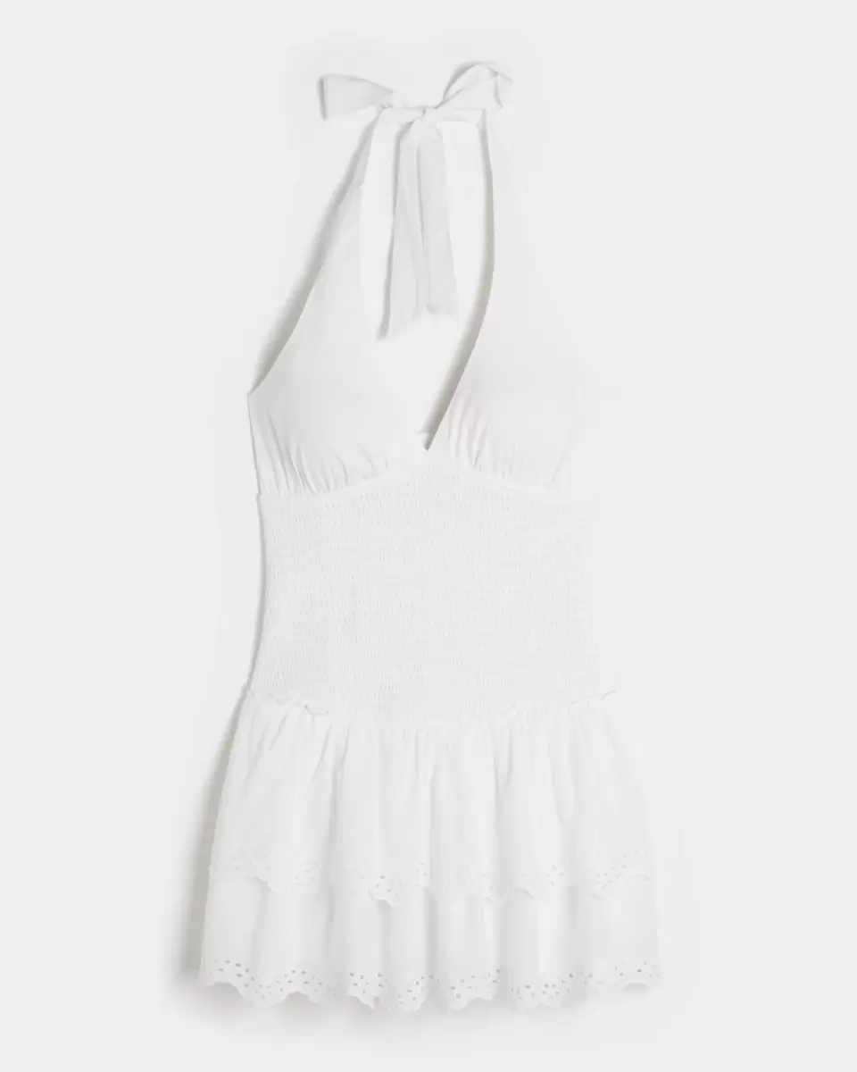 Denna söta skortklänning har en dubbelkjol och en mjuk smockad midja. Inbyggda shorts med ficka, avtagbara kuddar, grimremmar. Importerad.