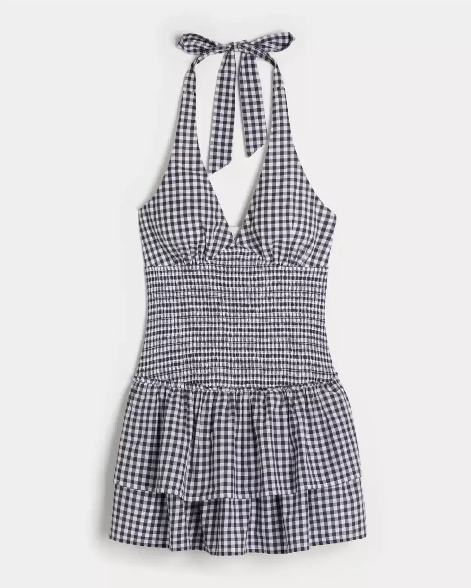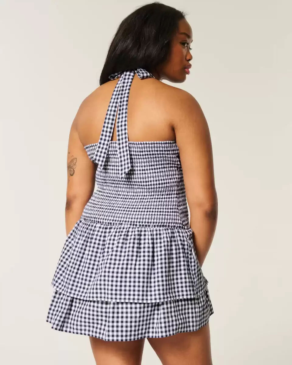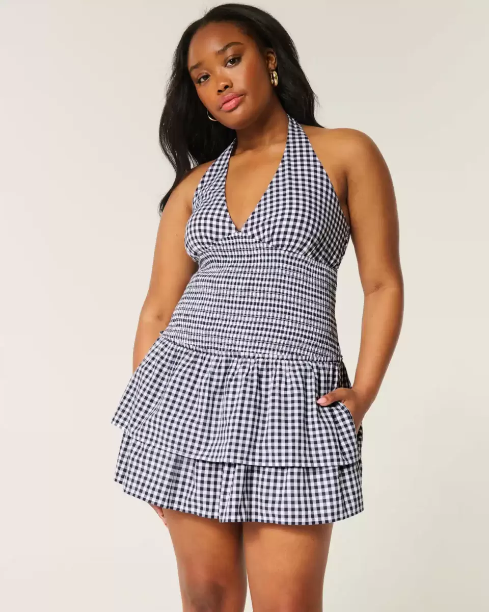Denna söta skortklänning har en dubbelkjol och en mjuk smockad midja. Inbyggda shorts med ficka, avtagbara kuddar, grimremmar. Importerad.