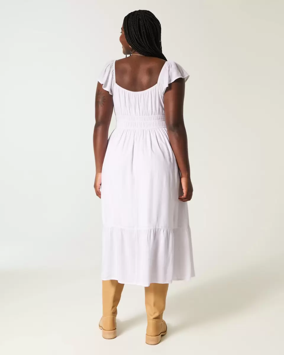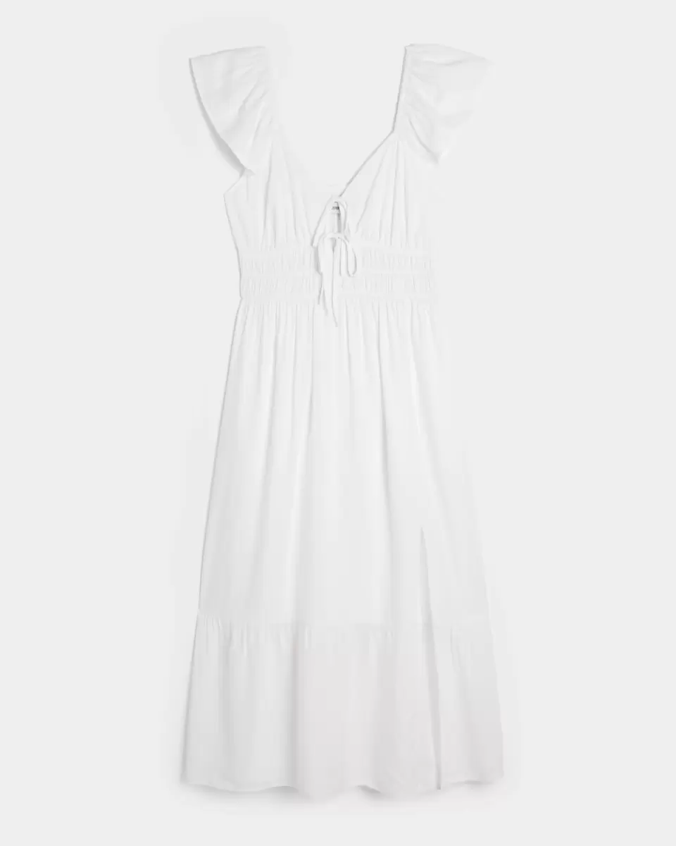 Vacker och supermjuk, den här midilånga klänningen har fladdrande ärmar, fickor och en knytdetalj framtill. Kanaliserad midja med dubbla knytband. Importerad.