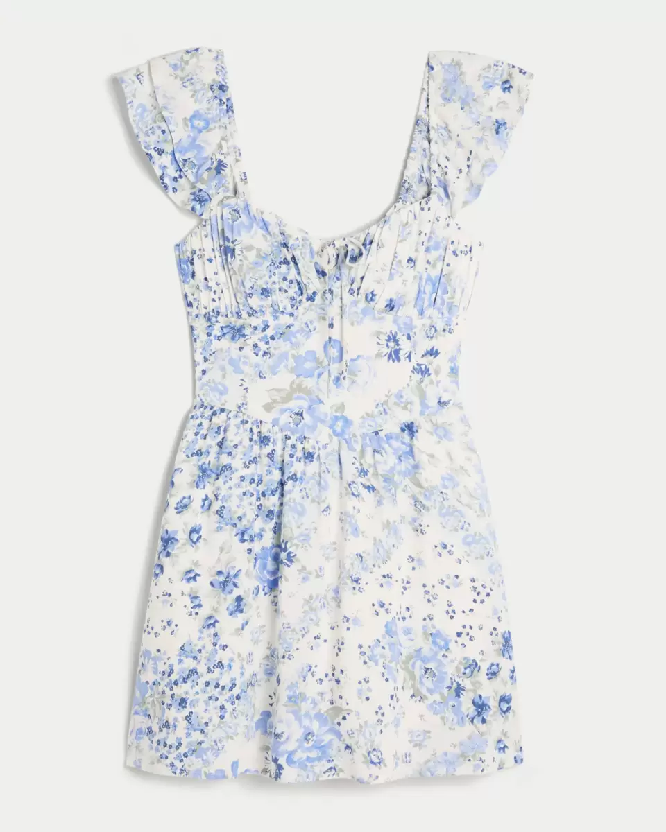 Vacker och supermjuk, den här klänningen har rynkade detaljer genom bysten, en knytdetalj fram och fladdrade ärmar. BH-täckande ryggdetalj, flytande kjol, dolda shorts, fickor. Importerad.