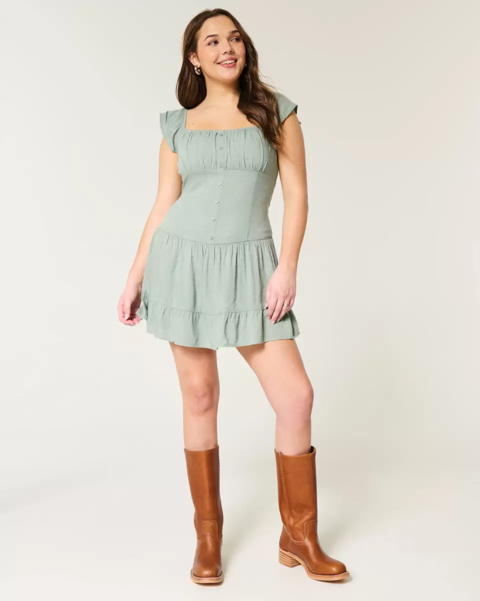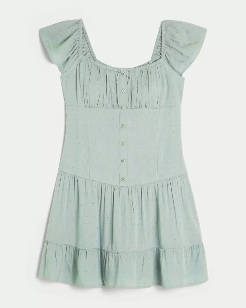 Vacker och supermjuk, den här klänningen har rynkade detaljer genom bysten, fladdrande ärmar och mittknappsdetaljer. Flödig kjol, dolda shorts. Importerad.