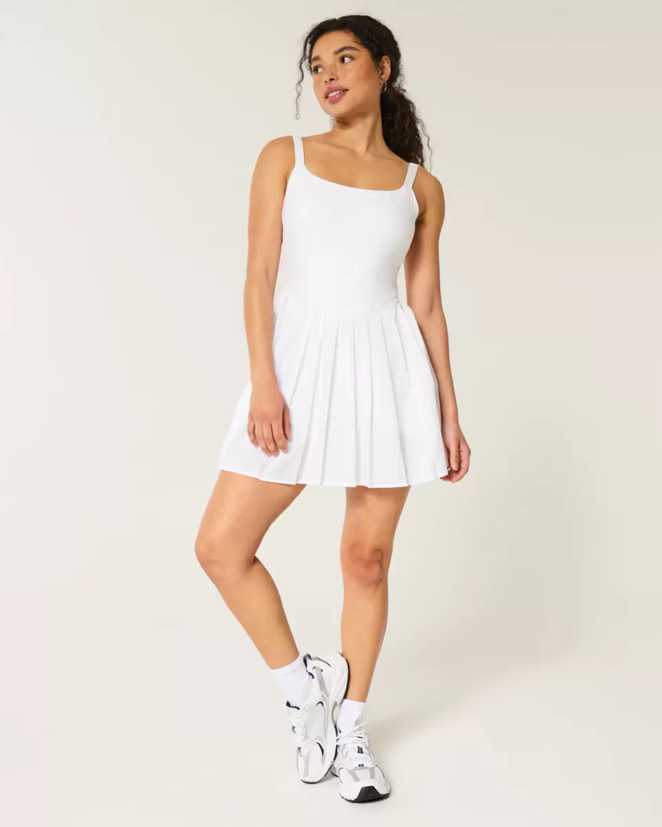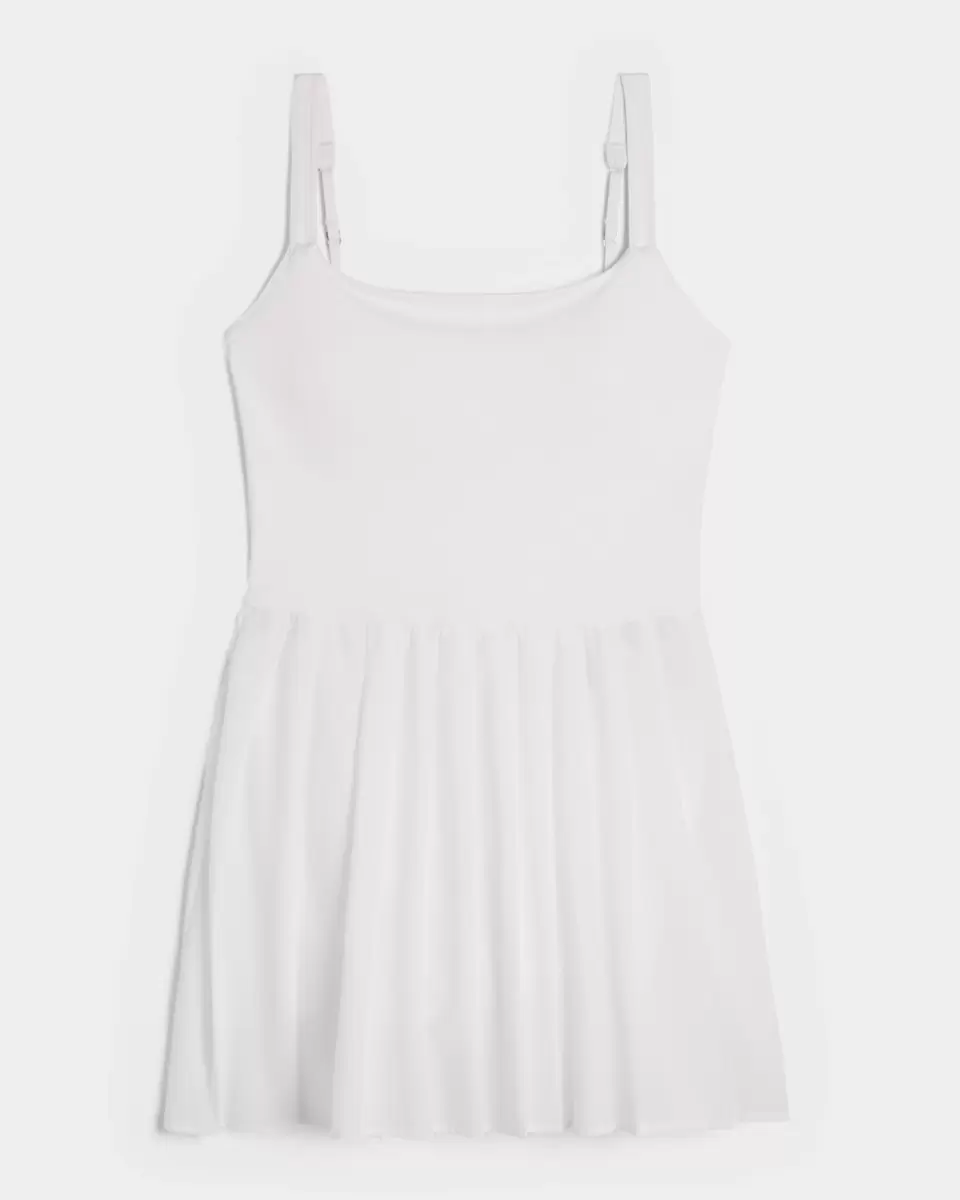 Denna söta och bekväma aktiva klänning har en inbyggd hyll-bh med avtagbara kuddar och inbyggda badrumsvänliga shorts. Justerbara axelband, vacker veckad kjol. Importerad.