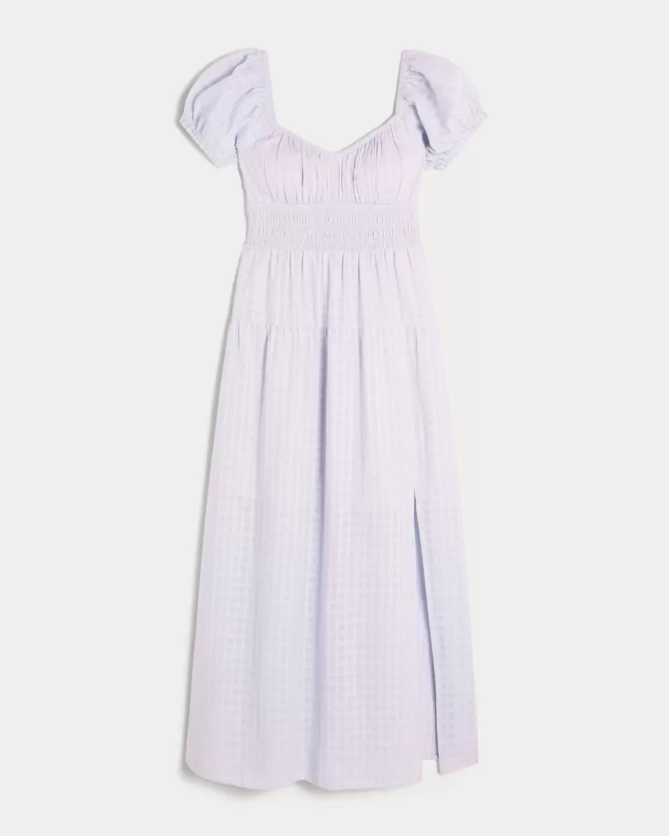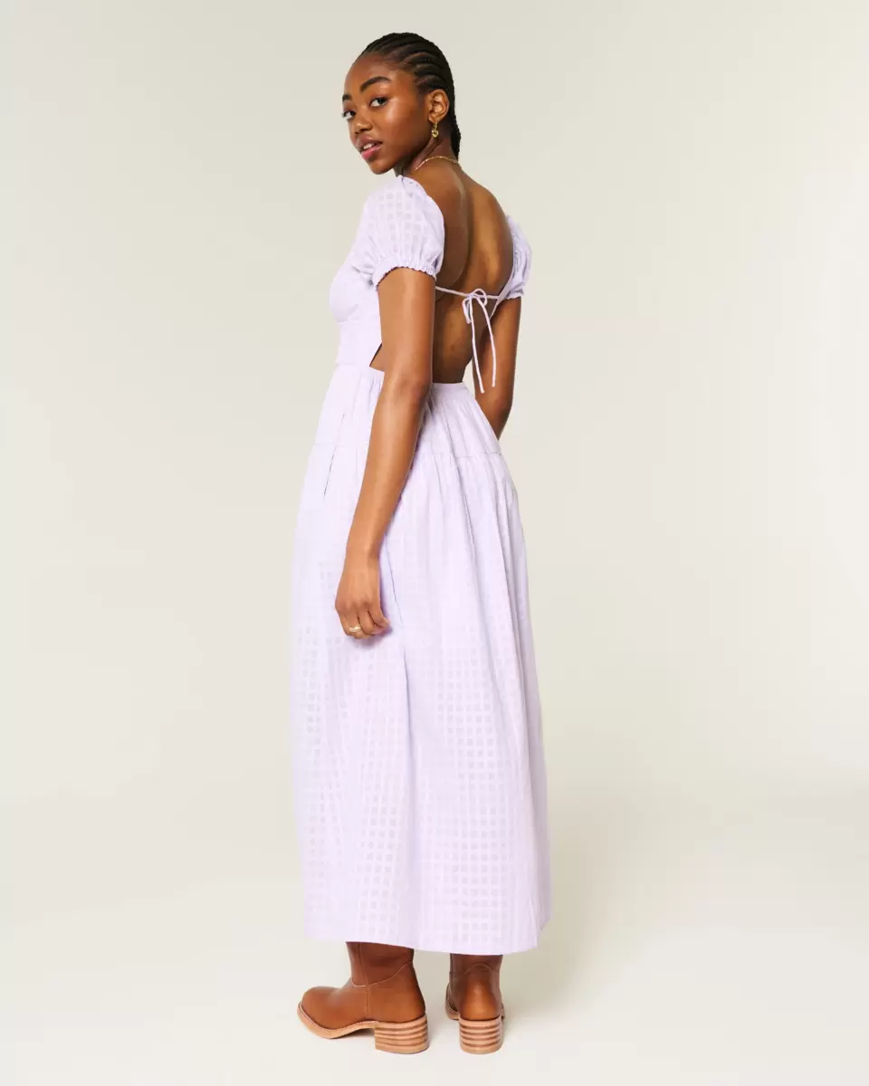 En vacker och supermjuk maxilång klänning med en öppen ryggdetalj och avtagbara kuddar. Korta ärmar, fickor, mjuk smockad midja, delad fålldetalj. Importerad.