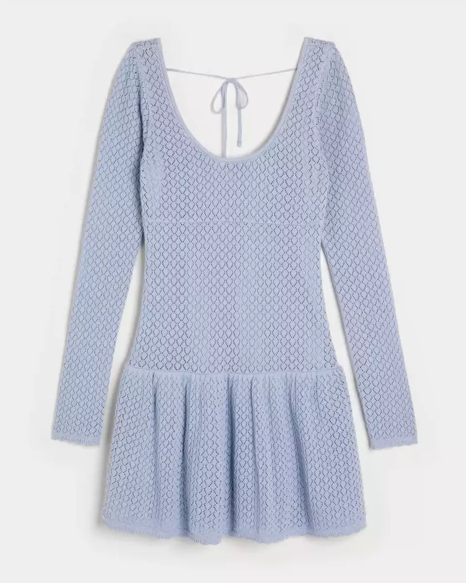 En söt och supermjuk långärmad klänning med virkade mönster, en skaterkjol och öppen rygg. Inbyggd hyllbh, scoop urringning. Importerad.