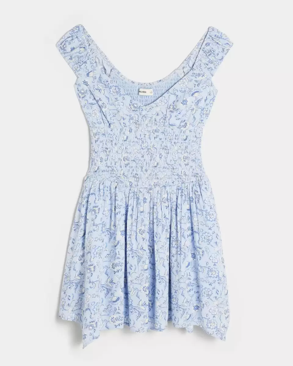 Supermjuk och vacker, den här off-the-shoulder miniklänningen har fickor och en smockad midja. Asymmetrisk fåll.
