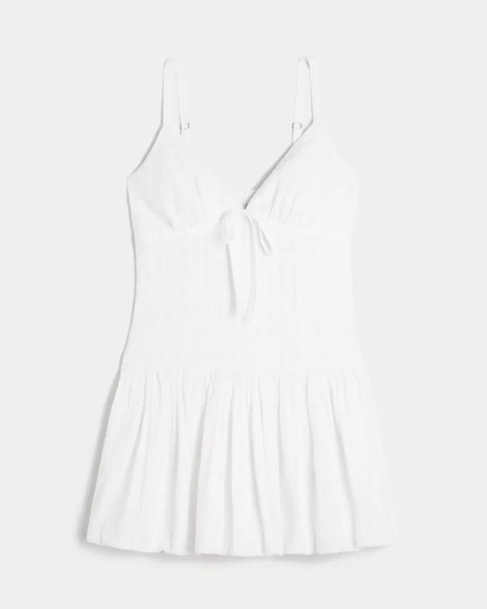 En supermjuk och vacker miniklänning med v-ringad bubbelfåll, justerbara smala remmar och dropp midja. Snygg knytdetalj, fickor, inbyggda shorts. Importerad.