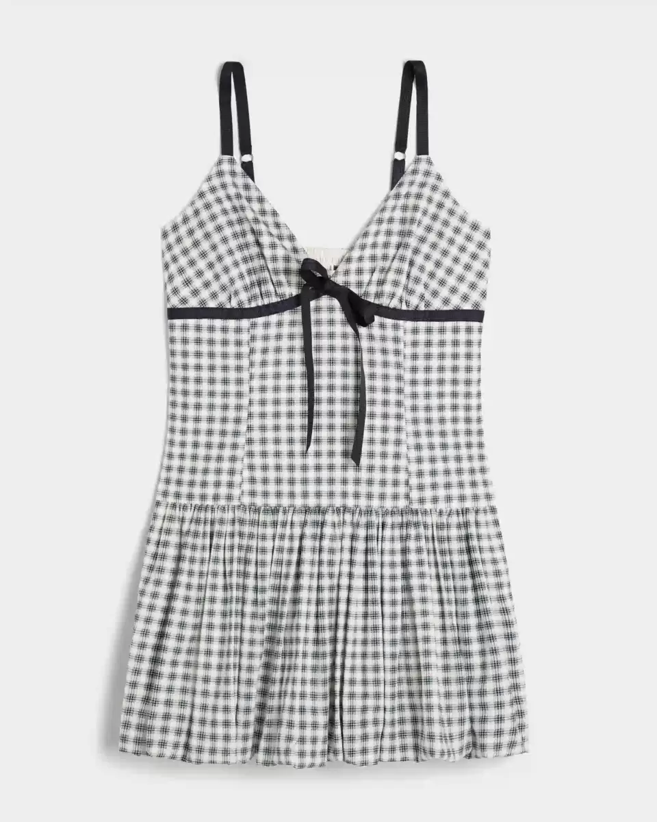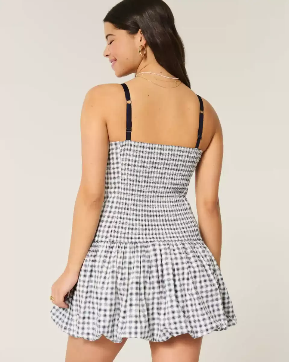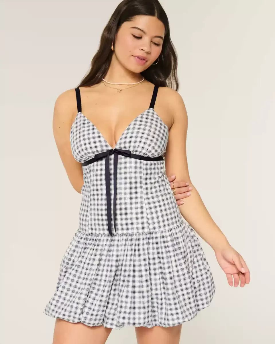 En supermjuk och vacker miniklänning med v-ringad bubbelfåll, justerbara smala remmar och dropp midja. Snygg knytdetalj, fickor, inbyggda shorts. Importerad.