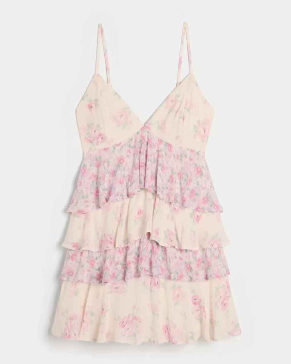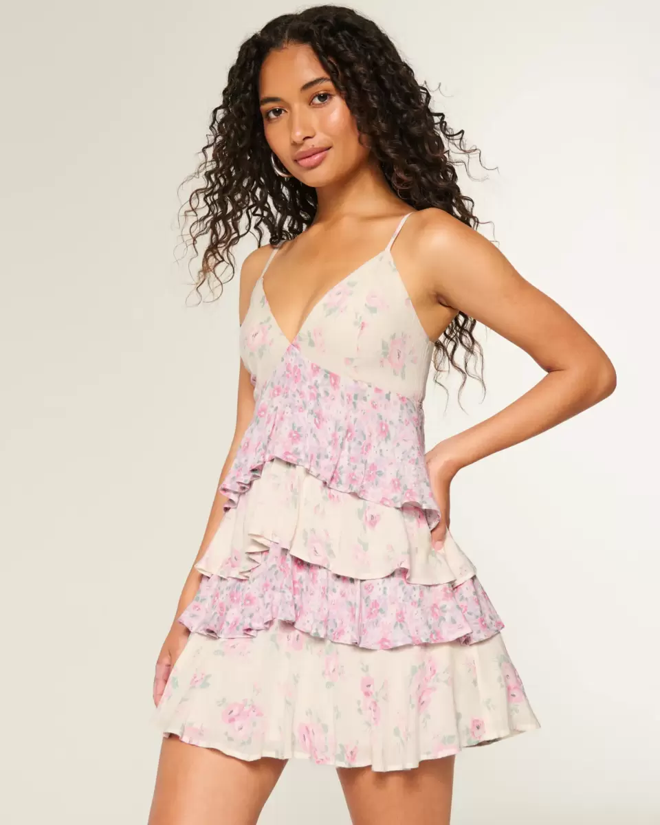 Flytig och supermjuk, den här miniklänningen har vackra volangnivåer och en v-ringning. Ryggdetalj, avtagbara kuddar, fickor. Importerad.